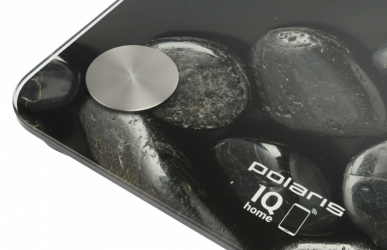 Скругленная по углам панель весов 28×28 см сделана из многослойного стекла и имеет четыре металлических диагностических контакта. Под стеклом располагается субъективно приятная или, как минимум, не раздражающая взор картинка с мокрыми камнями.