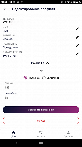 При заполнении профиля мы вводим имя, фамилию, псевдоним и возраст пользователя. Антропометрические же данные доступны после нажатия на ссылку «Polaris Fit»: это, пожалуй, единственный не слишком очевидный момент в использовании приложения.