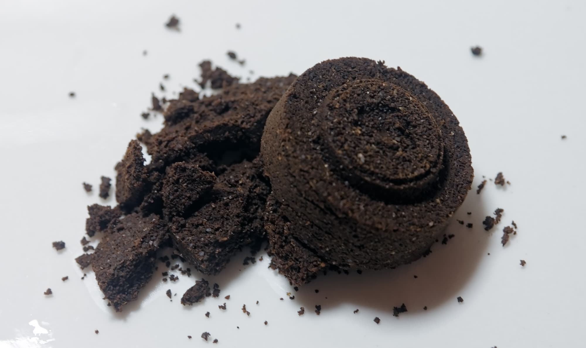 Отработанный кофе в процессе работы кофемашинки превратился в спрессованную «таблетку».