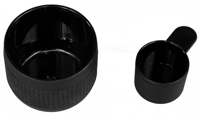 В комплект поставки также входит пластиковый мерный стаканчик для молотого кофе, по совместительству выполняющий роль темпера. Когда кофеварка не используется, он хранится внутри стакана для кофе. Для хранения самой кофеварки можно использовать специальный мешочек с самозатягивающимися завязками, напоминающий своим видом и синтетическим материалом туристические мешки для палаток и снаряжения.