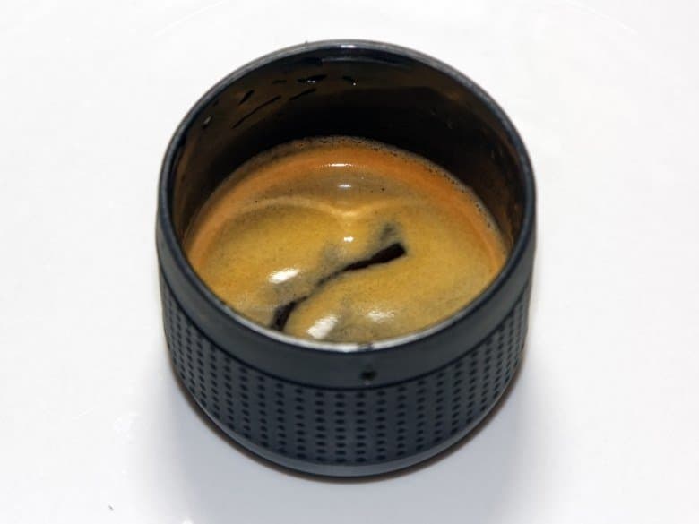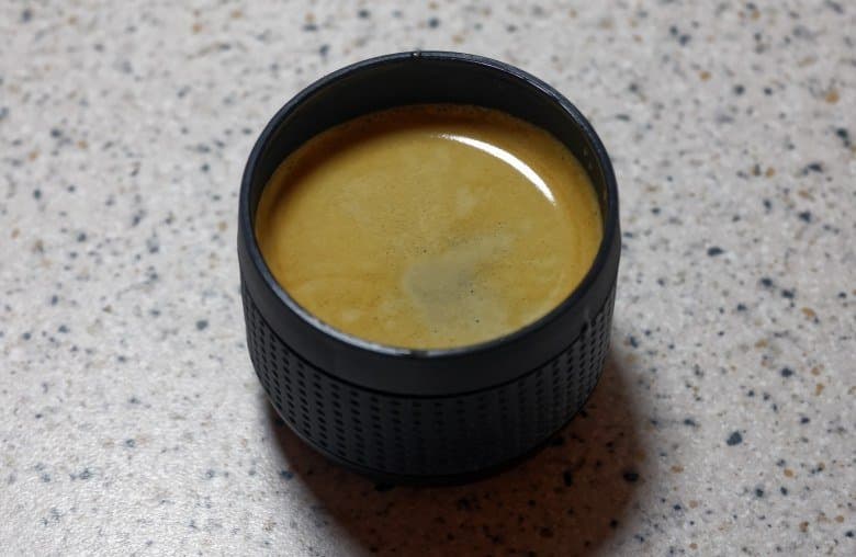 Процесс приготовления занял около 30 секунд, в течение которых мы нажали на рычаг помпы около 25 раз. Объем готового напитка составил 67 мл (13 мл воды в процессе приготовления «застряли» внутри кофеварки).