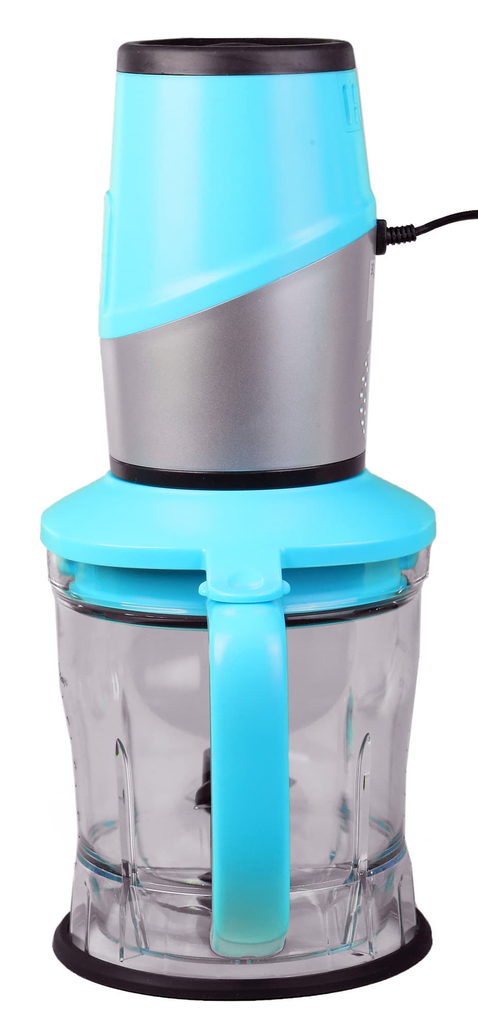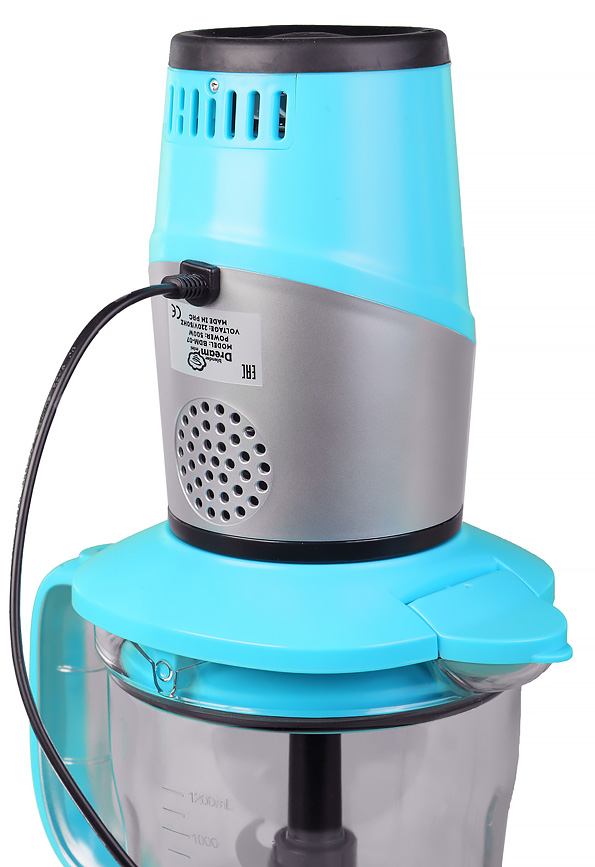 Моторный блок и все аксессуары производят впечатление качественно изготовленных. Прочный, отлично обработанный пластик, приятные цвета, небольшой вес сделают эксплуатацию блендера легкой и приятной. Моторный блок сделан в форме цилиндра со слегка бочковатой боковой поверхностью. В оформлении применены два цвета: голубой, повторяющийся в дизайне стаканов и емкостей, и нейтральный матово-серебристый.