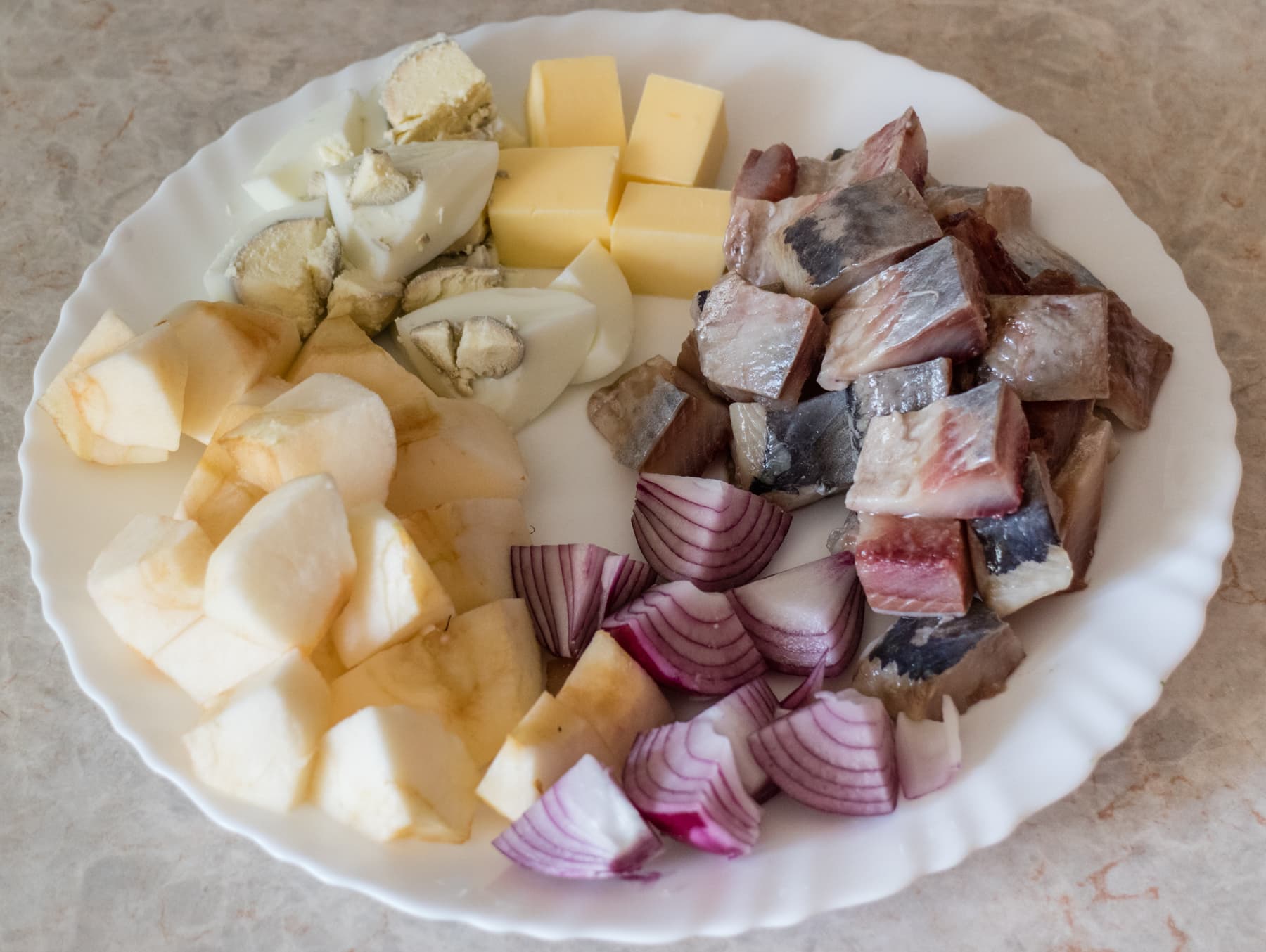 Сразу отметим, что рецепт довольно приблизительный, потому что вес селедки может отличаться почти в два раза, яйца кладут не все хозяйки, да и сливочного масла, опять же, можно положить больше или меньше. При приготовлении форшмака, конечно, нужно ориентироваться на свой вкус и предпочтения. Далее технология приготовления одинакова для всех вариантов рецепта: подготовить ингредиенты, нарезать их и измельчить. Для начала следует очистить селедку от кожи и костей, снять кожуру и удалить сердцевину яблока, очистить от скорлупы охлажденные вареные яйца, подготовить репчатый лук. Кусочки батона замочить в воде, затем хорошо отжать, удалив излишки влаги. После этого нарезать все продукты на кусочки, подходящие для измельчения. В соответствии с требованиями инструкции по эксплуатации, мы нарезали все ингредиенты кубиками примерно 2 на 2 см.