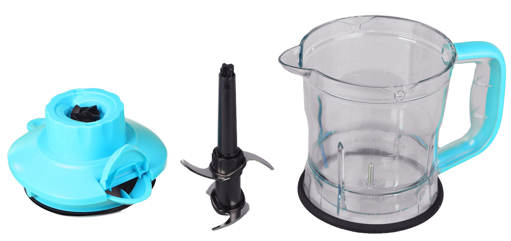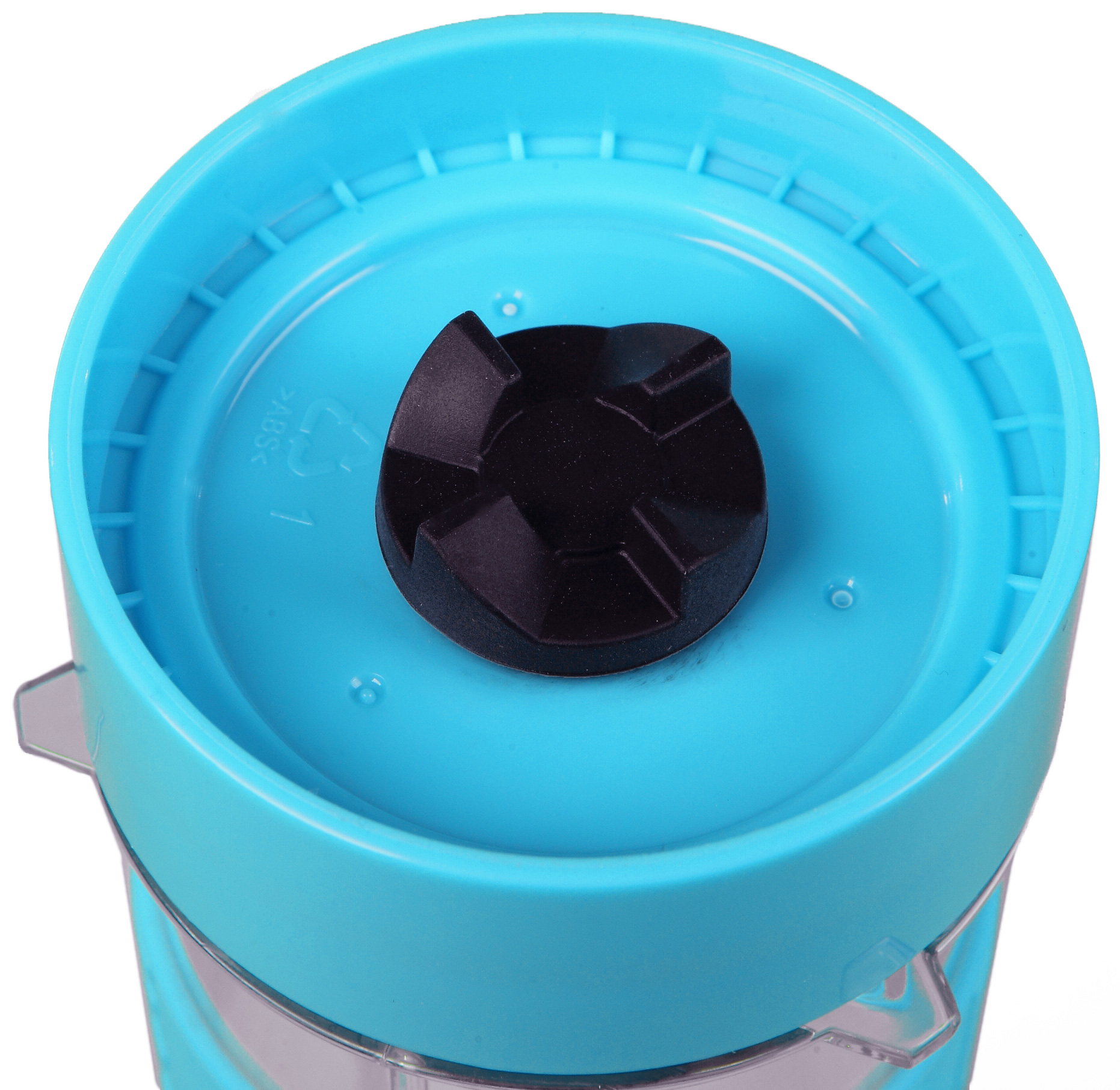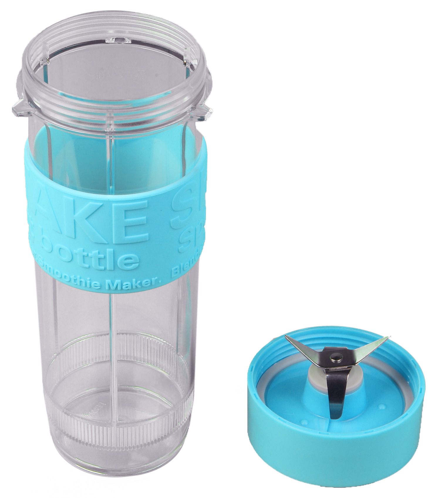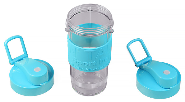 Все емкости мини-блендера изготовлены из прочного и безвредного тритана, устойчивого и к температуре, и к механическим повреждениям. Форма обоих спортивных стаканов идентична. На боковую поверхность надета резиновая вставка голубого цвета, на которой тиснеными буквами нанесены надписи. Благодаря материалу и тисненным буквам, стакан прочно удерживается в руке, не скользя даже во влажных ладонях. Обе емкости оснащены герметичными крышками, надеваемыми посредством закручивания по резьбе.