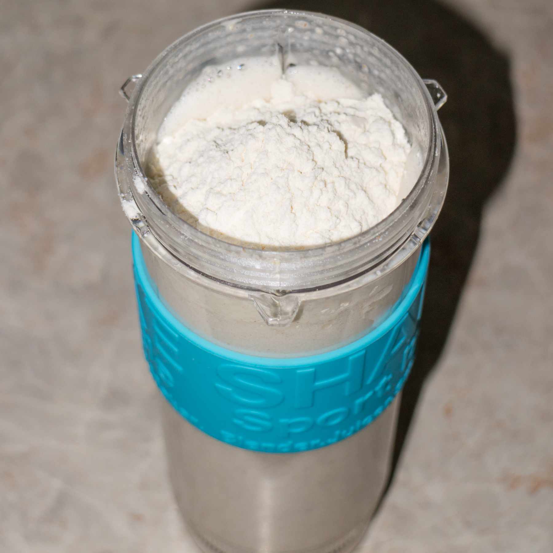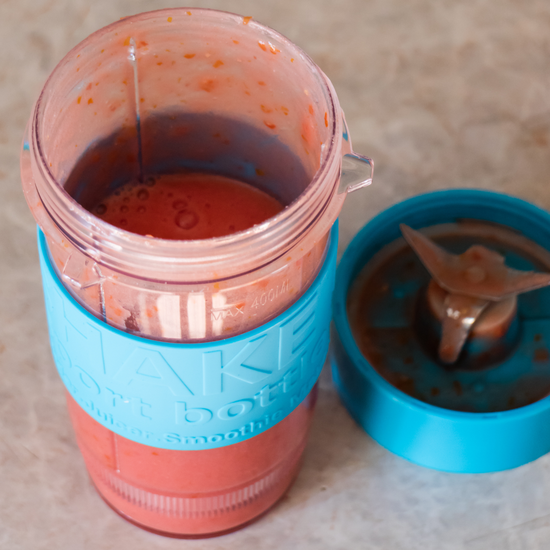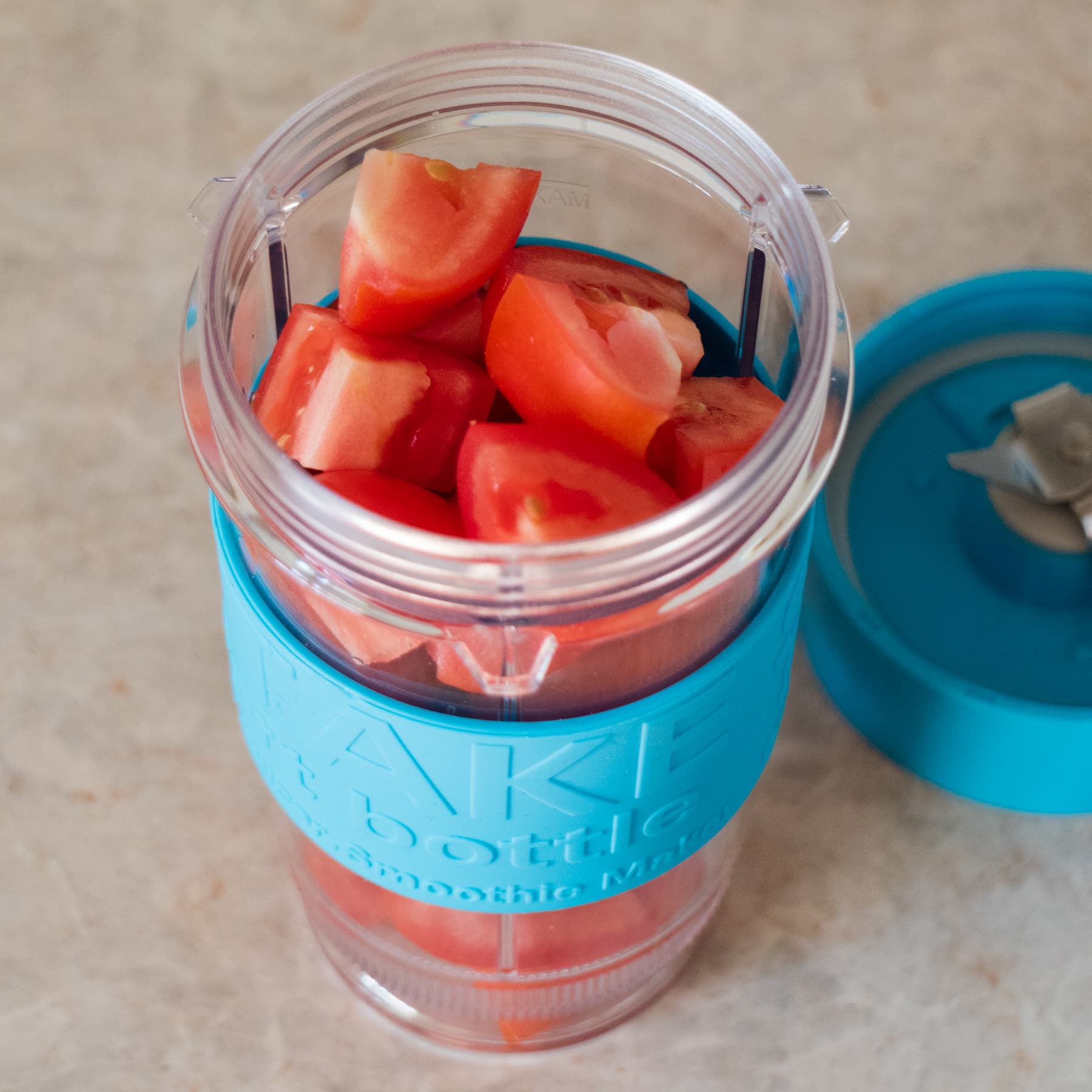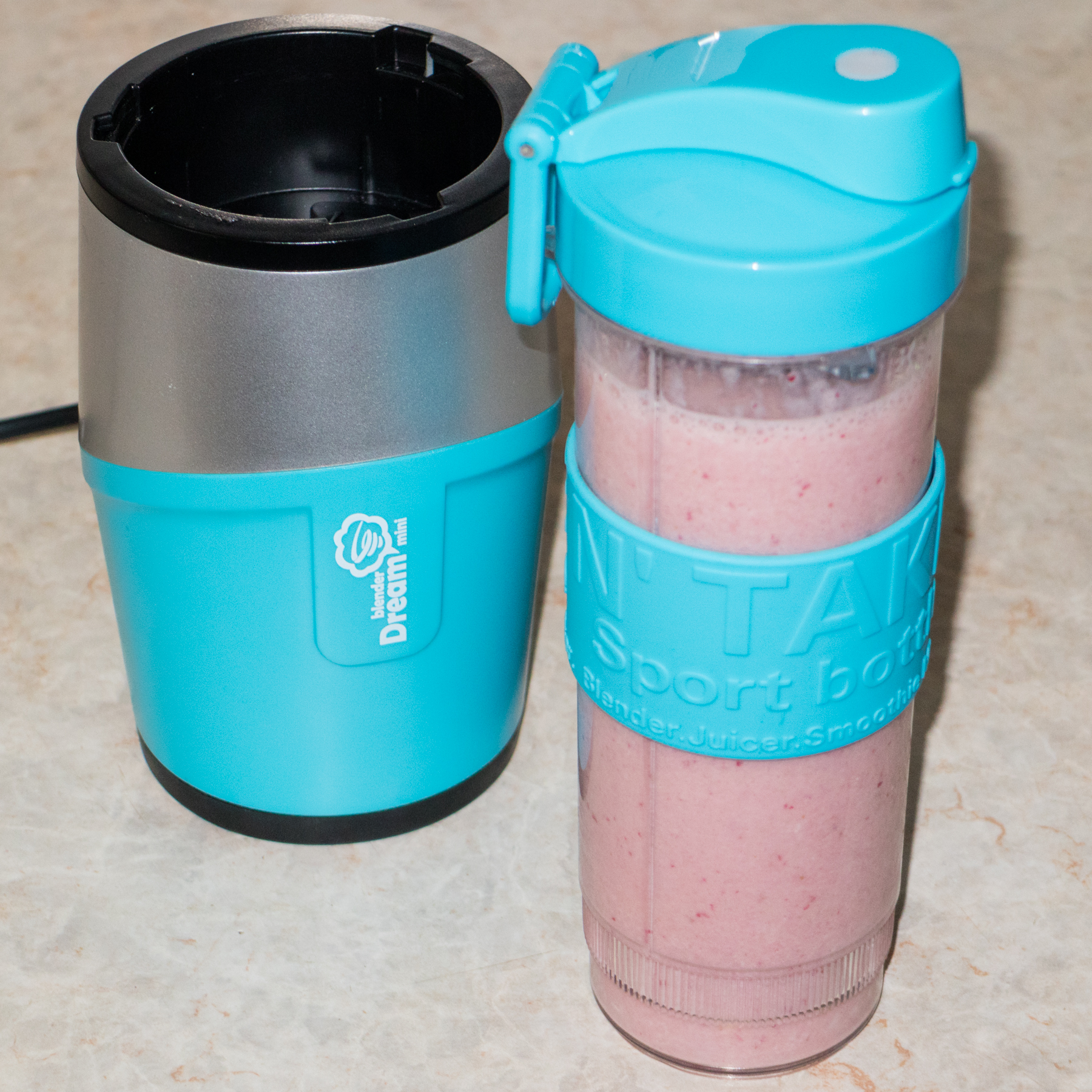 Все емкости мини-блендера изготовлены из прочного и безвредного тритана, устойчивого и к температуре, и к механическим повреждениям. Форма обоих спортивных стаканов идентична. На боковую поверхность надета резиновая вставка голубого цвета, на которой тиснеными буквами нанесены надписи. Благодаря материалу и тисненным буквам, стакан прочно удерживается в руке, не скользя даже во влажных ладонях. Обе емкости оснащены герметичными крышками, надеваемыми посредством закручивания по резьбе.