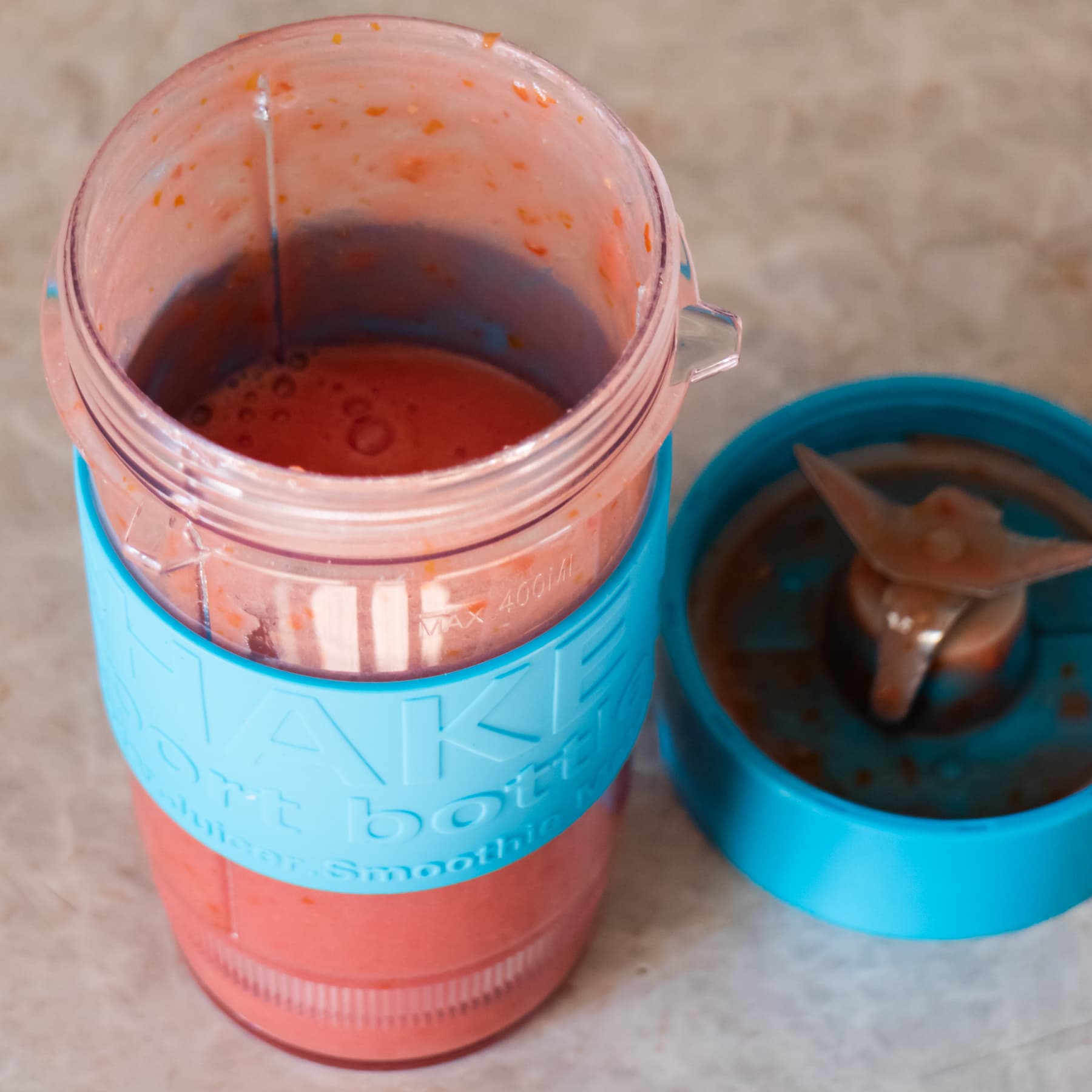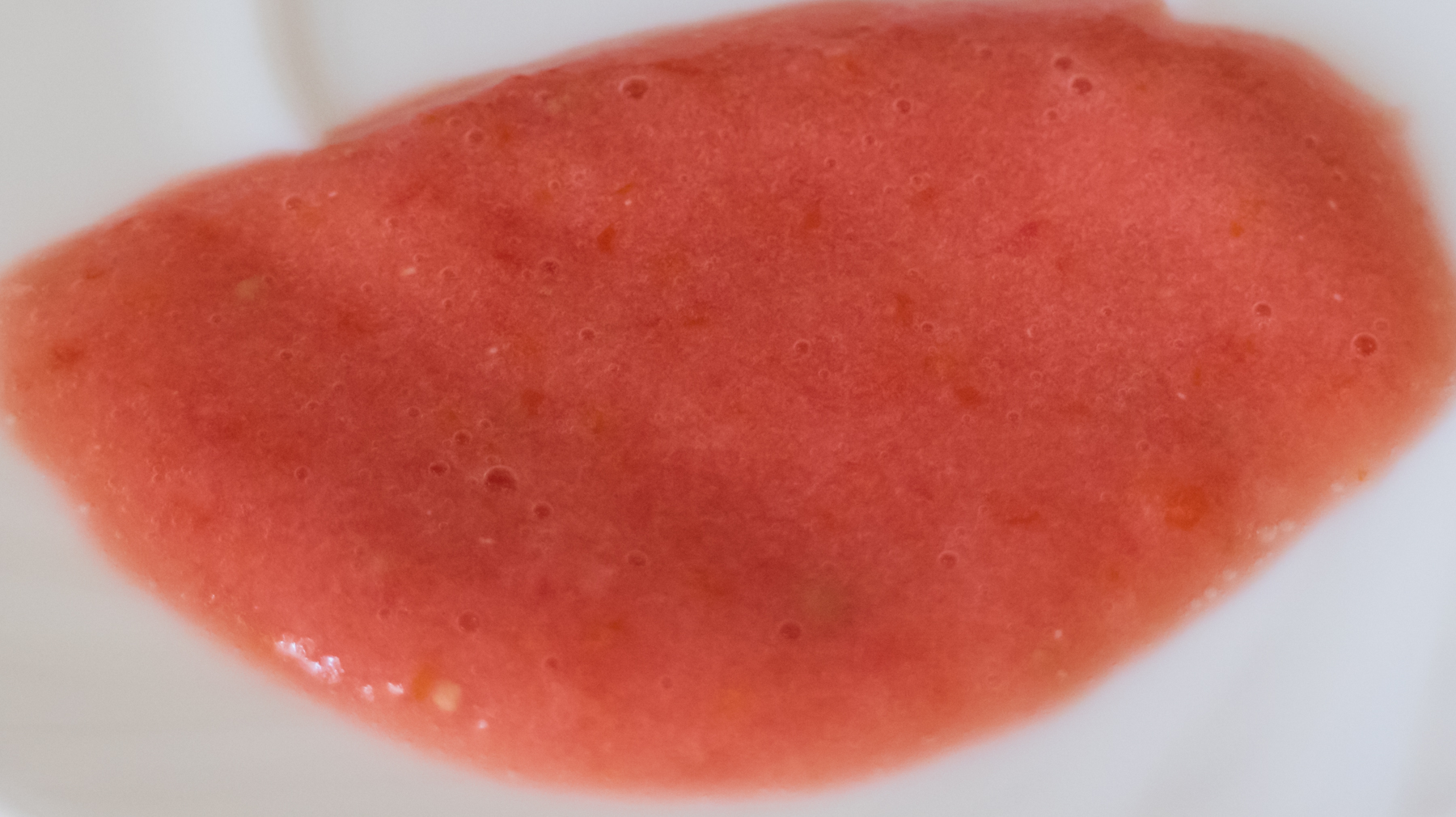 Качество блендирования нас поразило. Результат, по нашему мнению, превосходный для мини-блендера: лишь мелкие фрагменты шкурки и размолотые косточки. Масса практически гомогенизирована, имеет воздушную структуру.