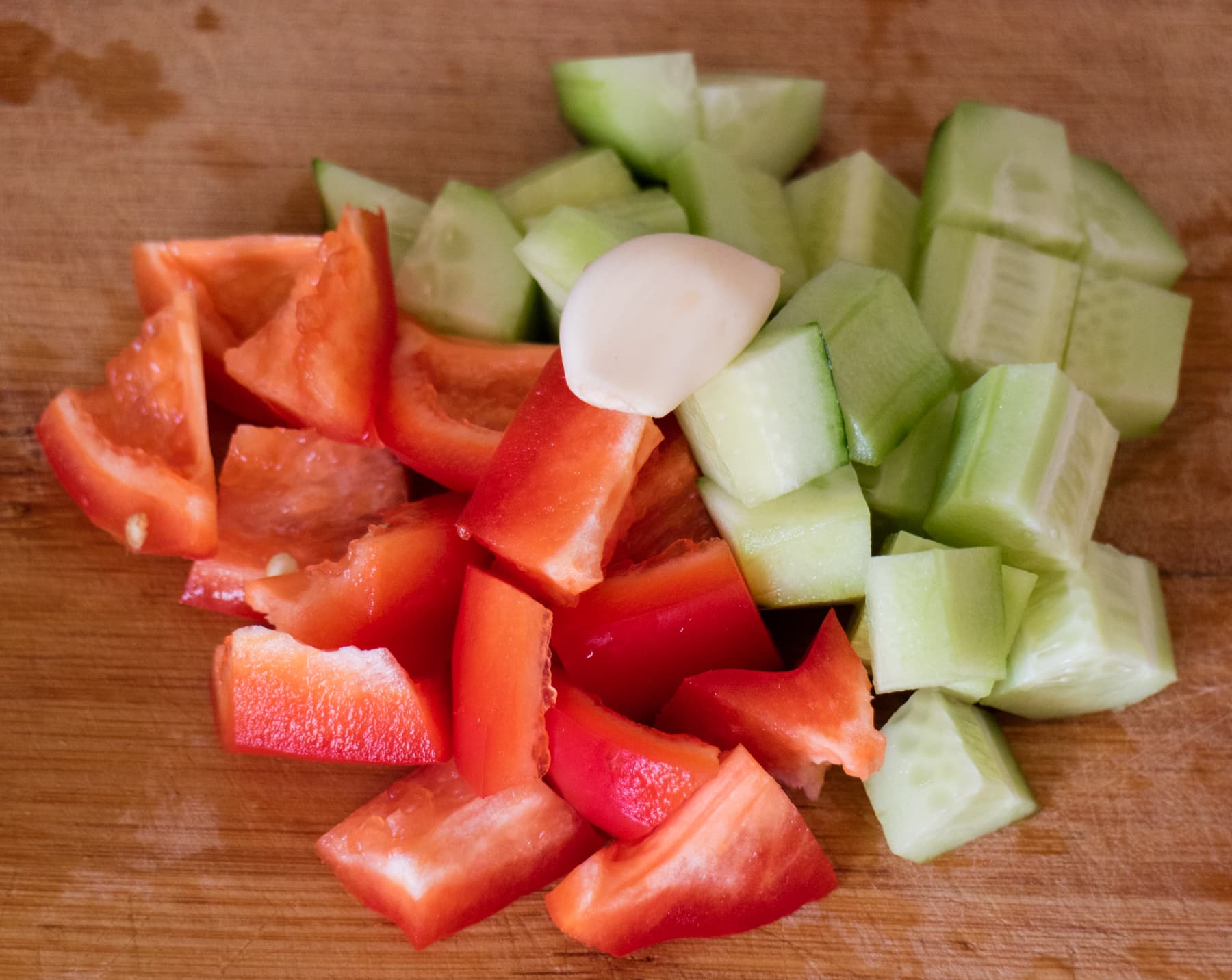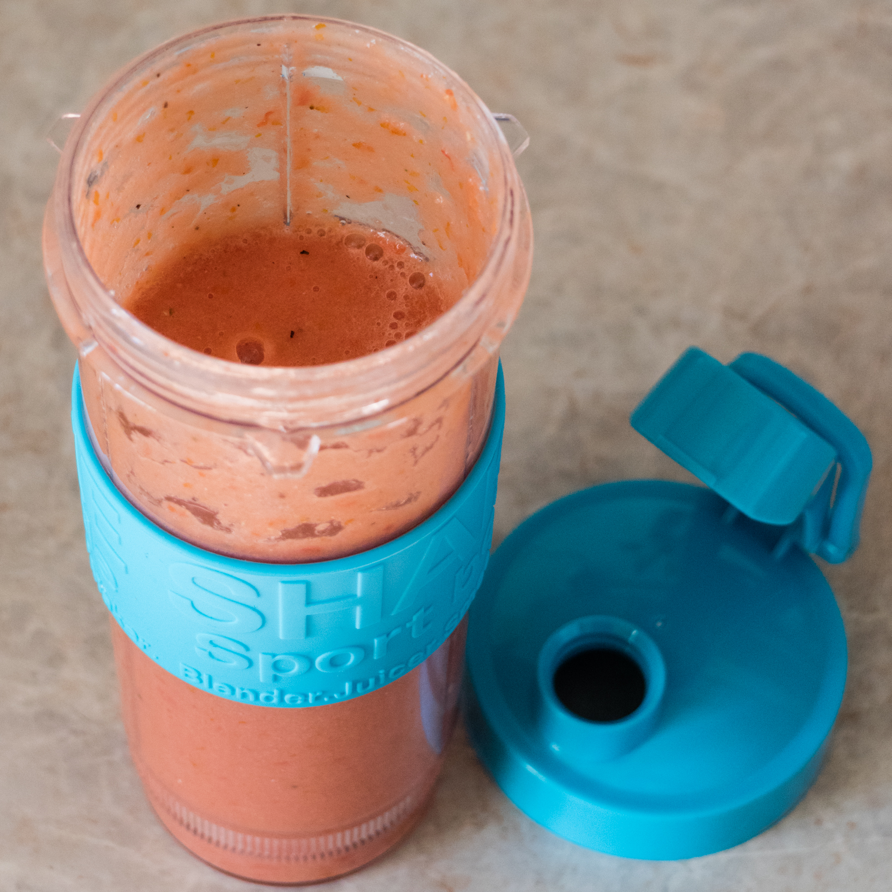 Полученный в предыдущем тесте помидорный сок был перелит в большой спортивный стакан. Затем добавили в него один огурец, половину болгарского перца, одну дольку чеснока, немного соли и черного перца.