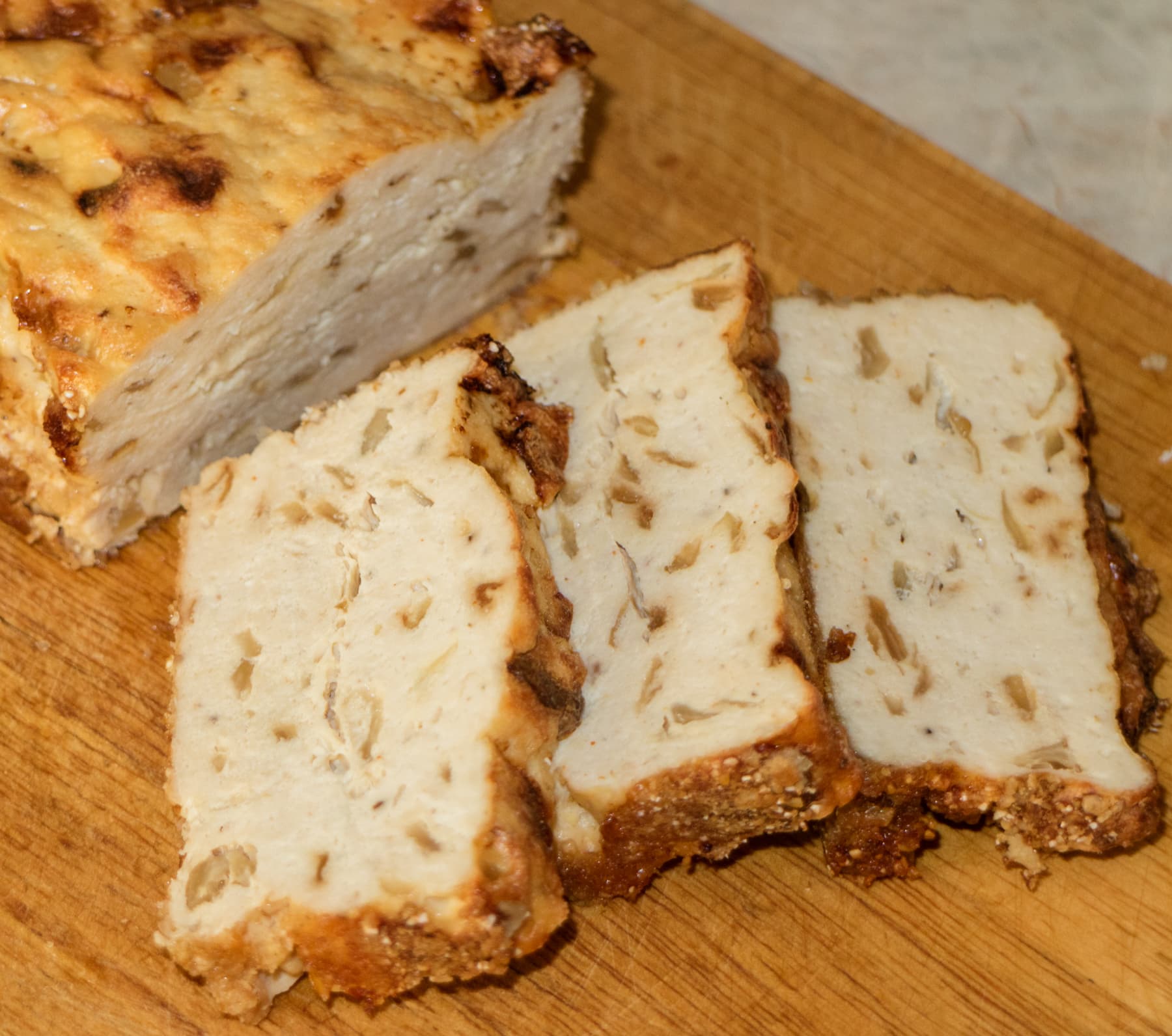 Затем обжарили на растительном масле мелко нарезанный репчатый лук и отставили в сторону для остывания. В это время взбили до устойчивых пиков три белка с щепоткой соли. Затем аккуратно смешали все подготовленные ингредиенты. Форму, в которой планировалось выпекать пудинг, смазали сливочным маслом и посыпали панировочными сухарями. Выложили в форму пудинговую массу, сверху положили несколько кусочков сливочного масла и посыпали панировочными сухарями. Выпекали в предварительно разогретой духовке 15 минут на 220 °C, затем на 180 °C до готовности.