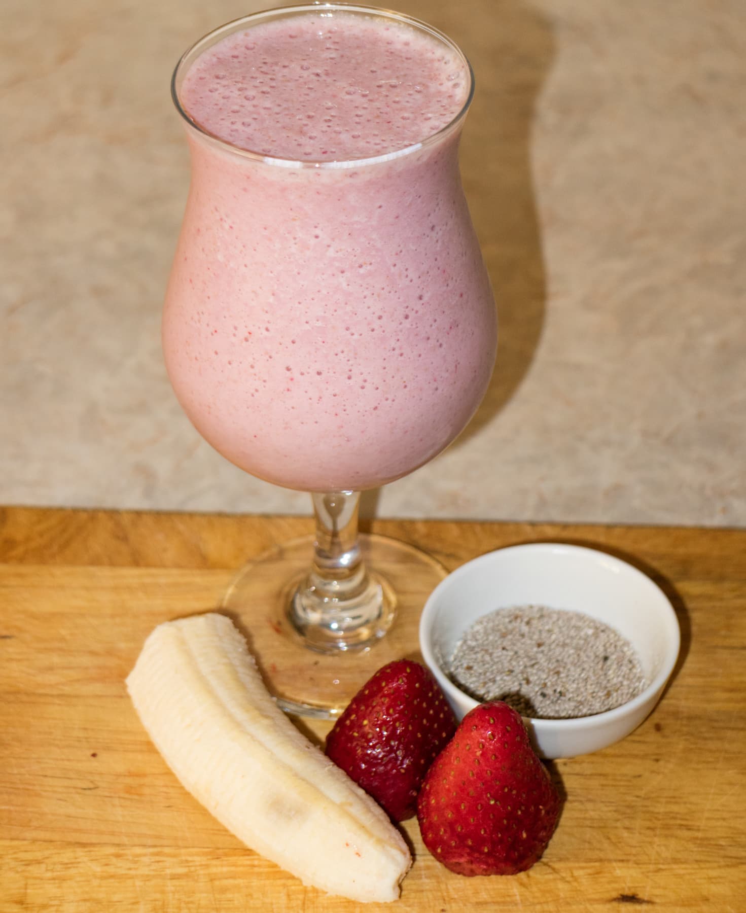 В большой спортивный стакан поместили нарезанный на кусочки банан, три замороженные и нарезанные ягоды клубники, 2 чайных ложки семян чиа, влили 200 мл молока. Накрутили блок ножей, перевернули стакан и разместили на корпусе мотора. Взбивание продолжалось примерно 20 секунд.