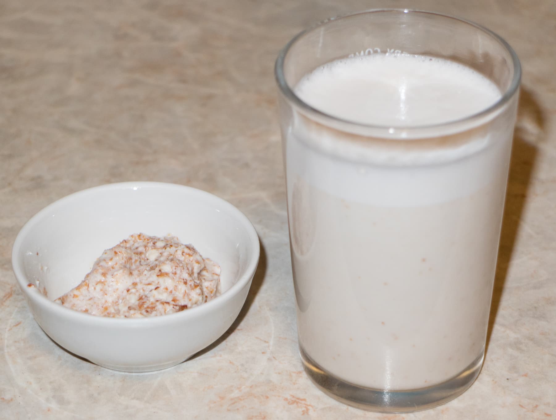 Затем измельчали в среднем спортивном стакане около 30 секунд. В завершение процедили полученный напиток через сито. Отходов было совсем немного. Вкус насыщенный, с ореховым оттенком.