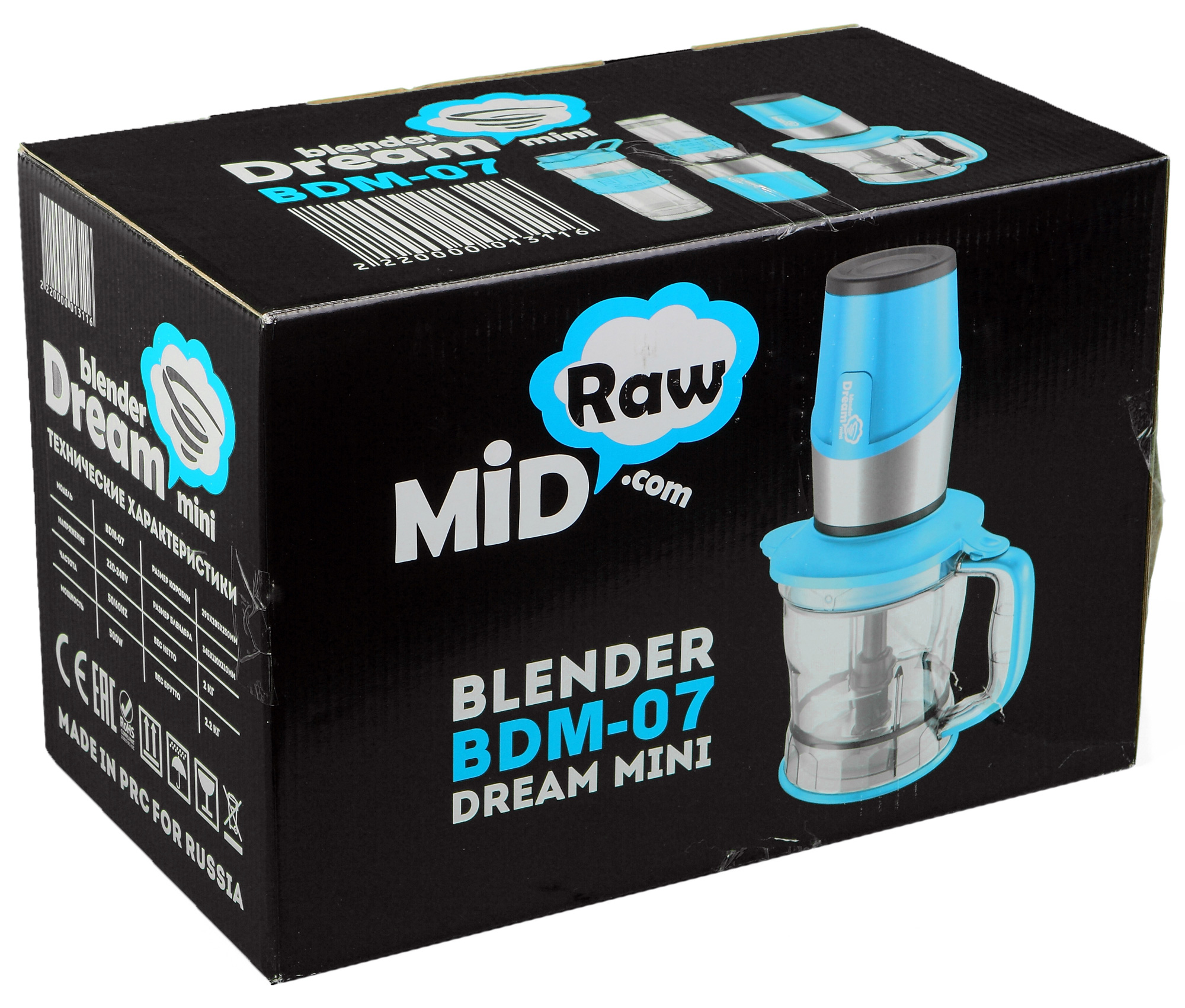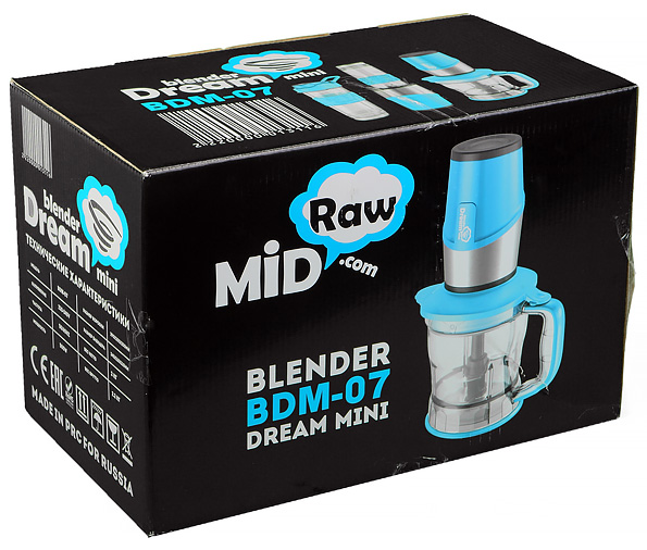 В тестовую лабораторию iXBT.com блендер попал в просто и одновременно красочно оформленной картонной коробке. Собственно, упаковка выполнена в обычном для Rawmid стиле: на черном фоне размещены яркие фотографии и описание устройства. На боковой стороне можно ознакомиться с краткими техническими характеристиками. В целом, знакомство с блендером, начатое с изучения коробки, можно оценить как успешное: первое впечатление складывается самое положительное, описание аксессуаров позволяет без проблем представить блюда и напитки, которые можно приготовить с помощью прибора. Хотя ручкой для переноски коробка не оснащена, вес и размеры ее невелики, так что проблем с транспортировкой у покупателя не возникнет.
