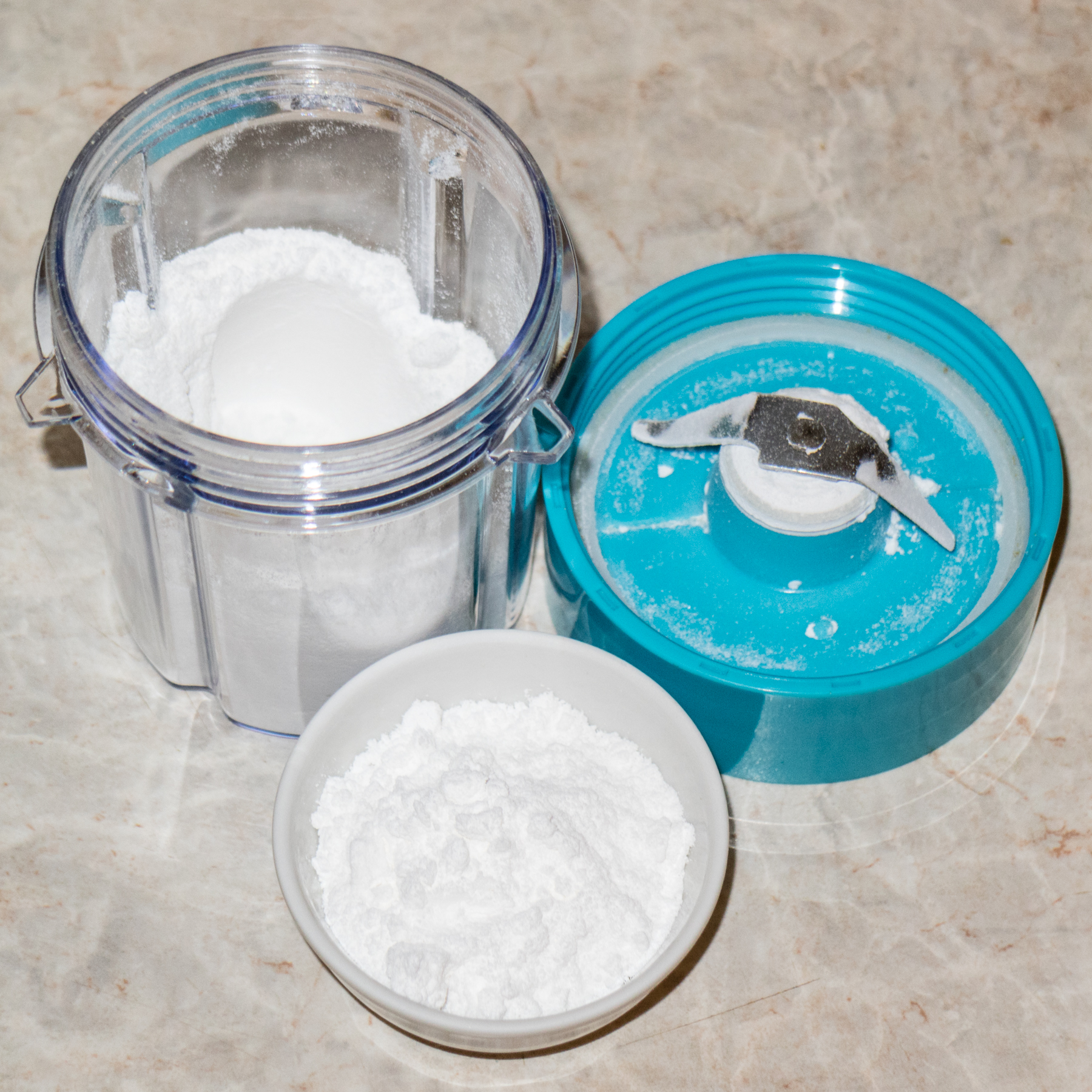 В следующем тесте мы усложнили задачу: блендеру предстояло превратить сахарный песок в пудру. Насыпали в емкость сахар до пометки Max. Вес сахара составил чуть более 50 граммов. Помол продолжался примерно 20-25 секунд.