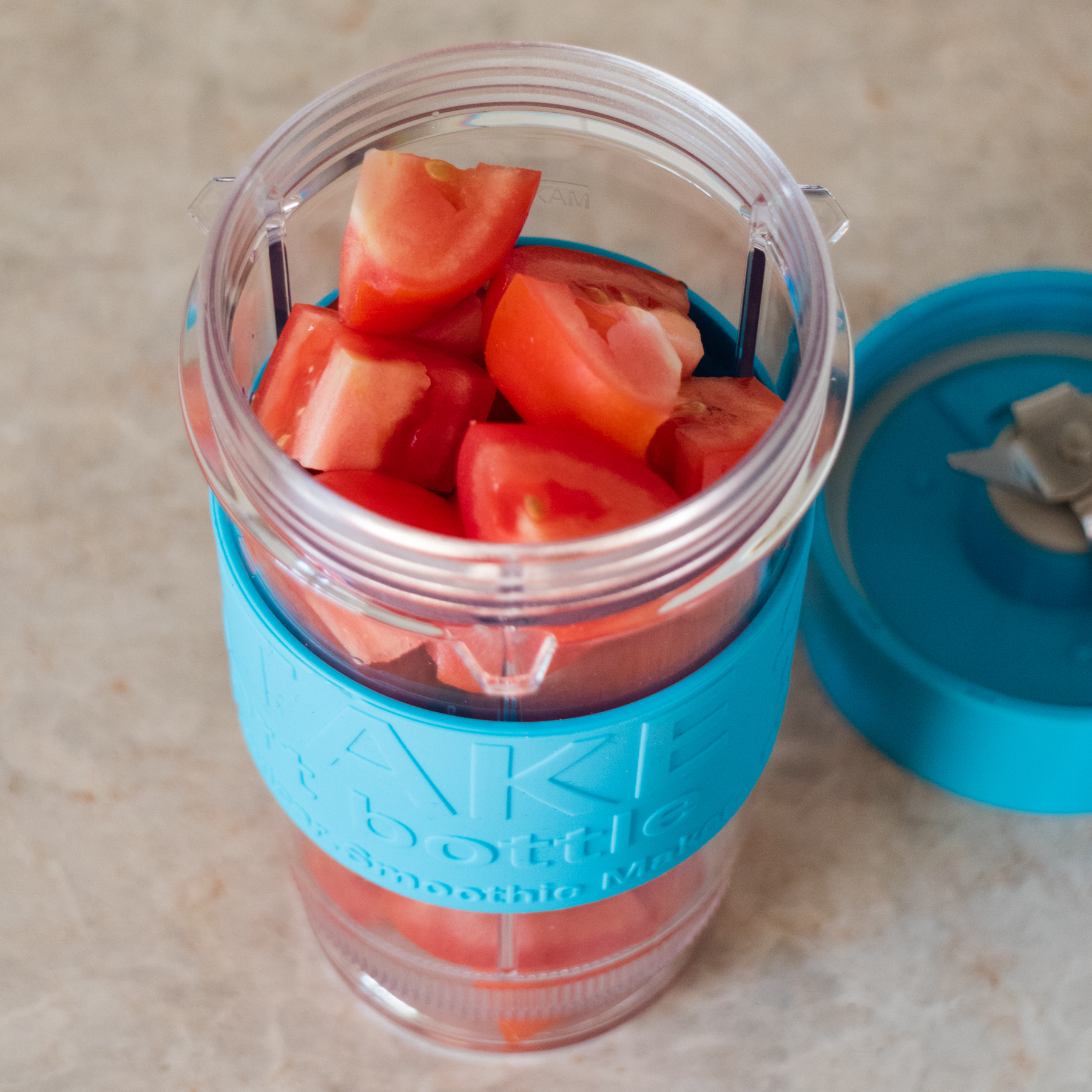 Изначально процедура блендирования пошла не очень удачно. Возможно, кусочки помидоров были великоваты, а возможно, причиной стали особенности ножевого блока. Кусочки томатов, после небольшого проворачивания, «стояли» на месте, как будто на лезвия ножей нанизались куски и не позволяли ничего измельчать. Тогда мы остановили работу и влили немного, буквально пару столовых ложек, воды. И тогда процесс пошел без замечаний и остановок.