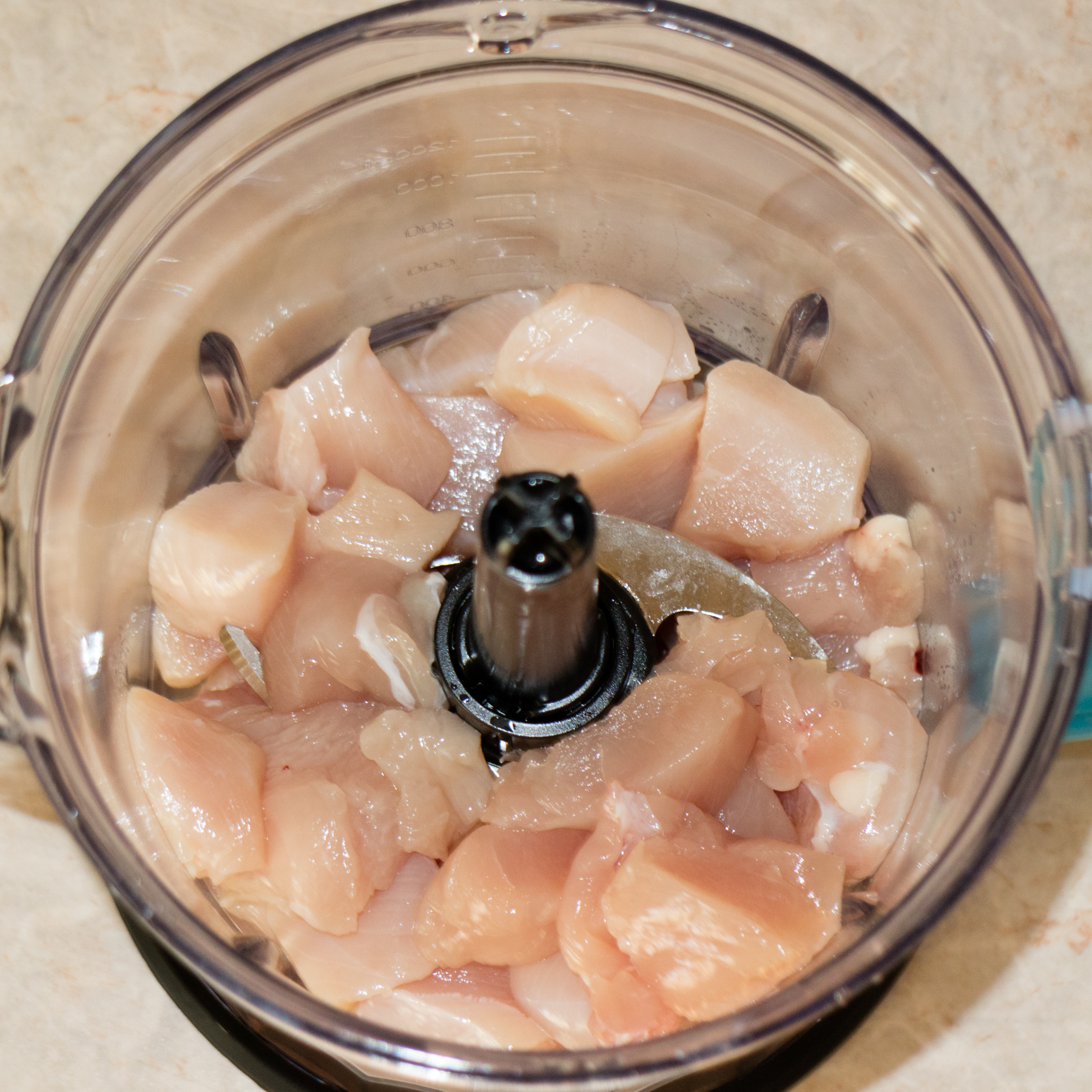 Инструкция рекомендует перемалывать за один раз 200 г мяса. Нарезав филе и поместив в чашу отмеренные по весу кусочки, мы испытали некоторые сомнения. Дело в том, что 200 г мяса для довольно большой емкости — это мало. Курица лежала на дне, даже не достигая верхнего уровня ножей. Поэтому, пренебрегая рекомендациями инструкции, мы поместили в чашу все 500 г филе.