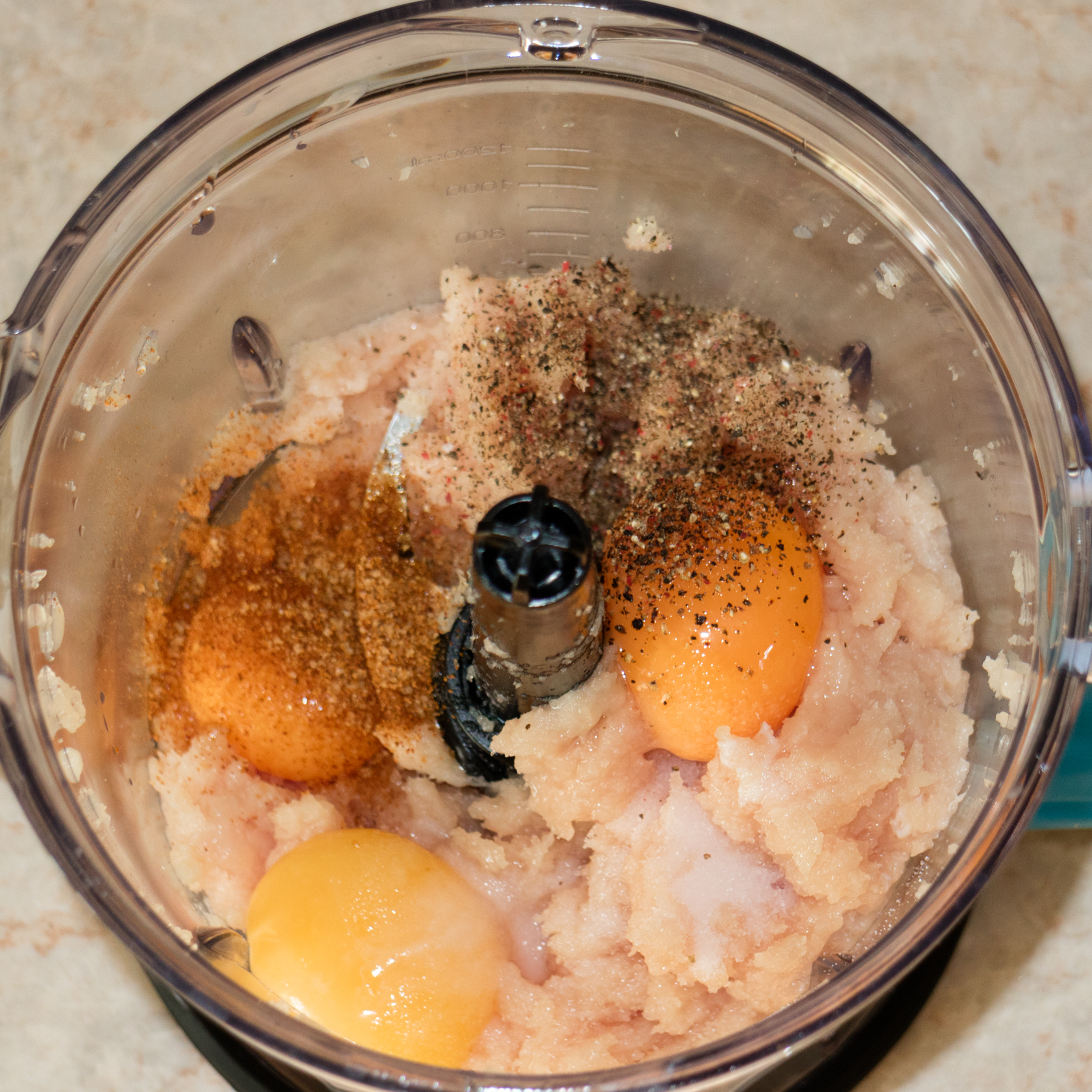 Обработка продолжалась около 40 секунд. За это время кусочки филе превратились в пастообразный фарш. Добавили к полученной массе три желтка, соль, перец и специи. Перемешали с помощью измельчителя еще раз.