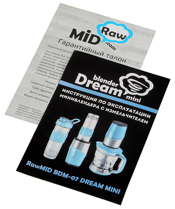 Руководство по эксплуатации представляет собой тоненькую четырехстраничную брошюрку формата А5. Первая страница документа оформлена в цветах и стиле Rawmid: на черном фоне размещены фотографии мини-блендера, его аксессуаров и название модели. Содержание не отличается оригинальностью: схема устройства с наименованием частей, сведения по безопасной эксплуатации, описание функций и правил использования, рекомендации по очистке и решению проблем.
