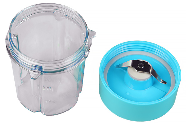 Форма малого стакана отличается от формы спортивных стаканов наличием четырех выступов с внутренней поверхности. Выступы, видимо, служат для равномерного распределения измельчаемого продукта и подачи его на острие ножа. Конструкция и метод крепления ножевого блока для малой емкости схожа с вышеописанной, однако нож является двухлепестковым.