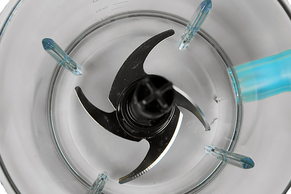 Четырехлепестковый нож из нержавеющей стали закреплен в пластиковом основании с прорезиненной прокладкой, защищающей от протекания. На стакан ножевой блок надевается как и крышка — закручиванием.