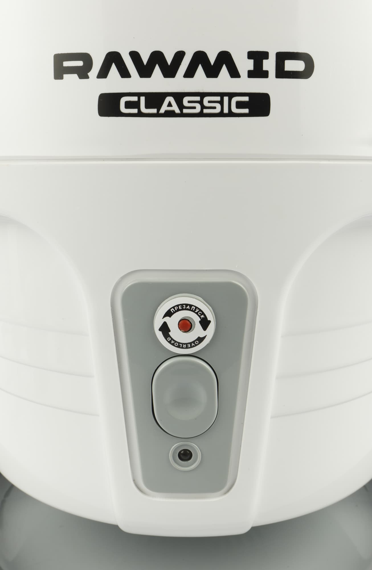 Над центральной кнопкой расположена маленькая красная кнопка «Перезапуск», в самом низу виден индикатор подключения к электрической сети. Он загорается ярко-красный светом при подключении прибора к розетке.
