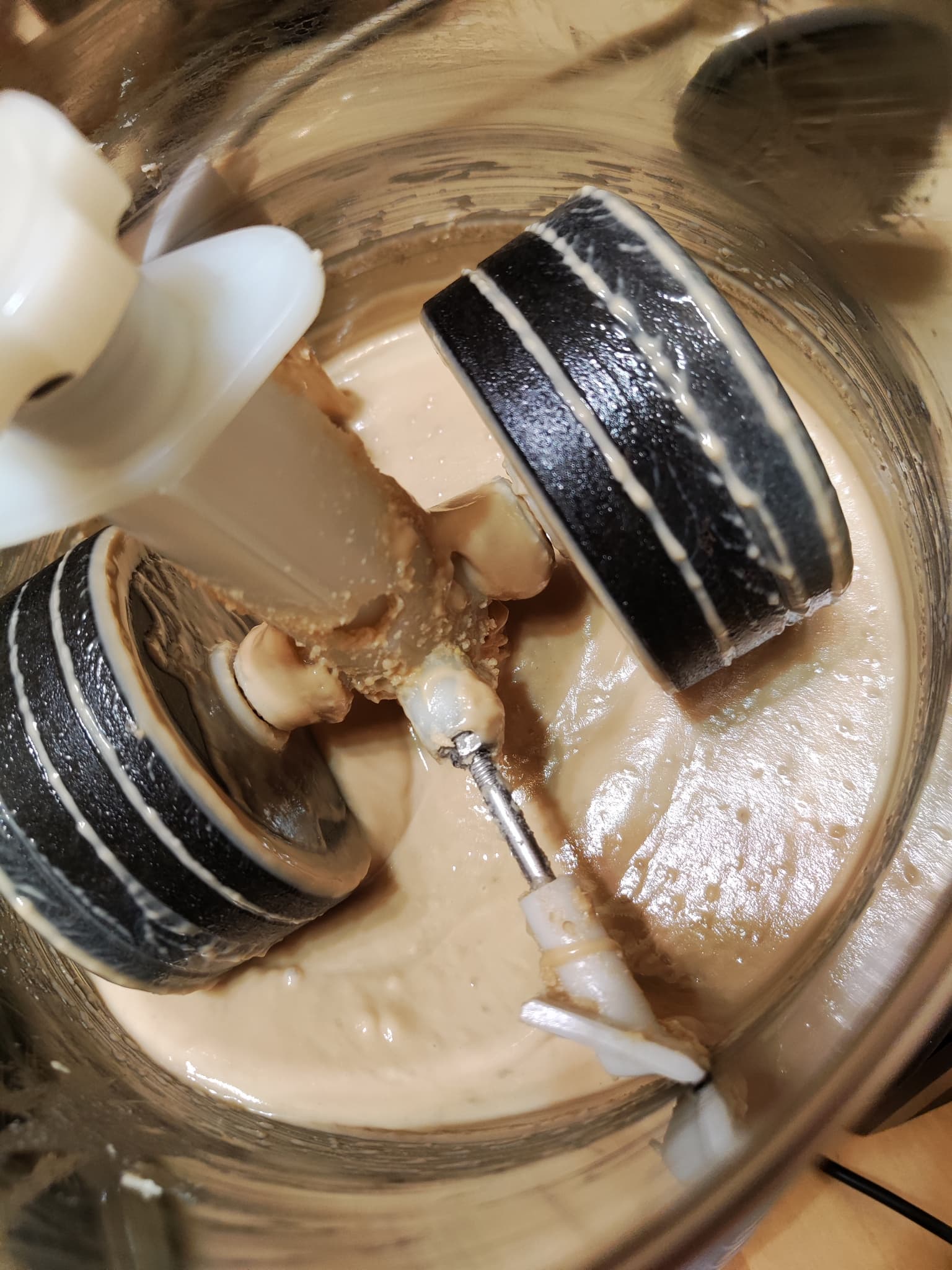 Минут через пятнадцать масса уже была жидкой, но в ней можно было различить отдельные фрагменты орехов. Через час паста, на первый взгляд, казалась готовой, но после того, как наклонили чашу и масса стекла к одному боку, стало видно, что частицы еще неоднородны. Поэтому подкрутили верхнюю пружину, чтобы прижать жернова чуть ближе ко дну, и оставили прибор работать еще на полчаса.