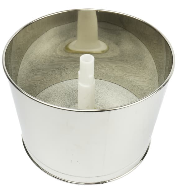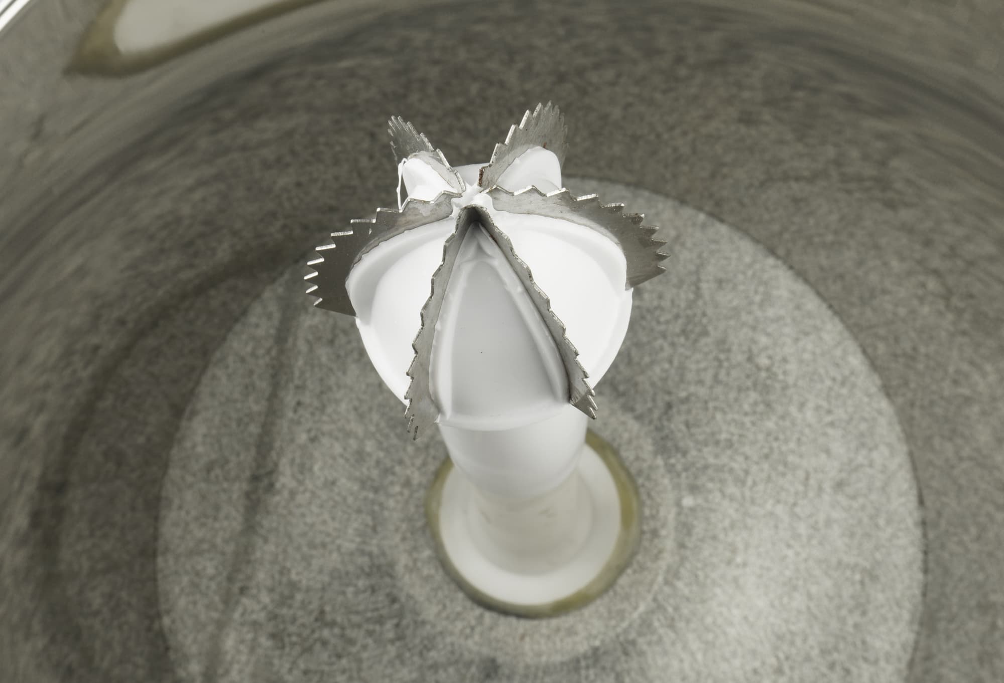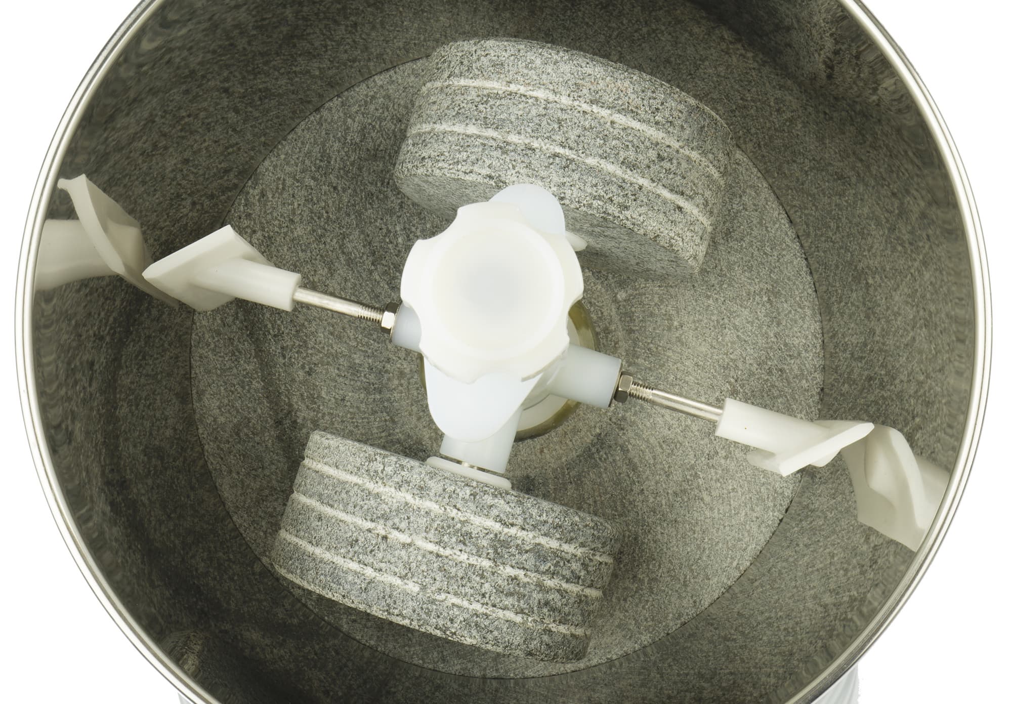 Теперь внимательно рассмотрим самое интересное — рабочую емкость и жернова. Чаша изготовлена из нержавеющей стали и гранита. Вес ее — 3,04 кг. По центру видим ось, предназначенную для крепления насадок.