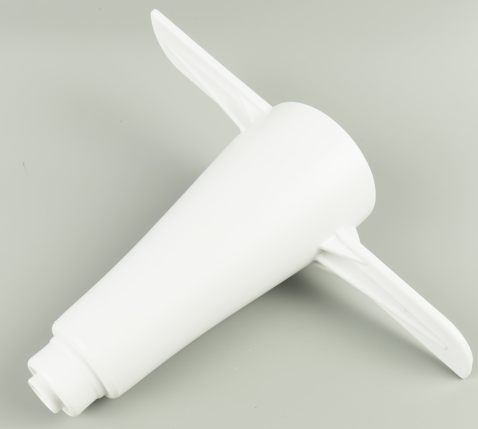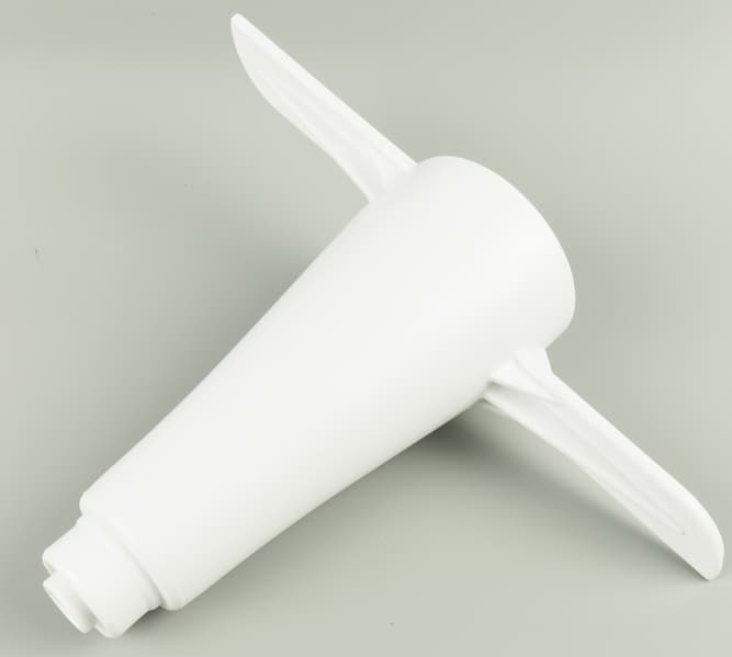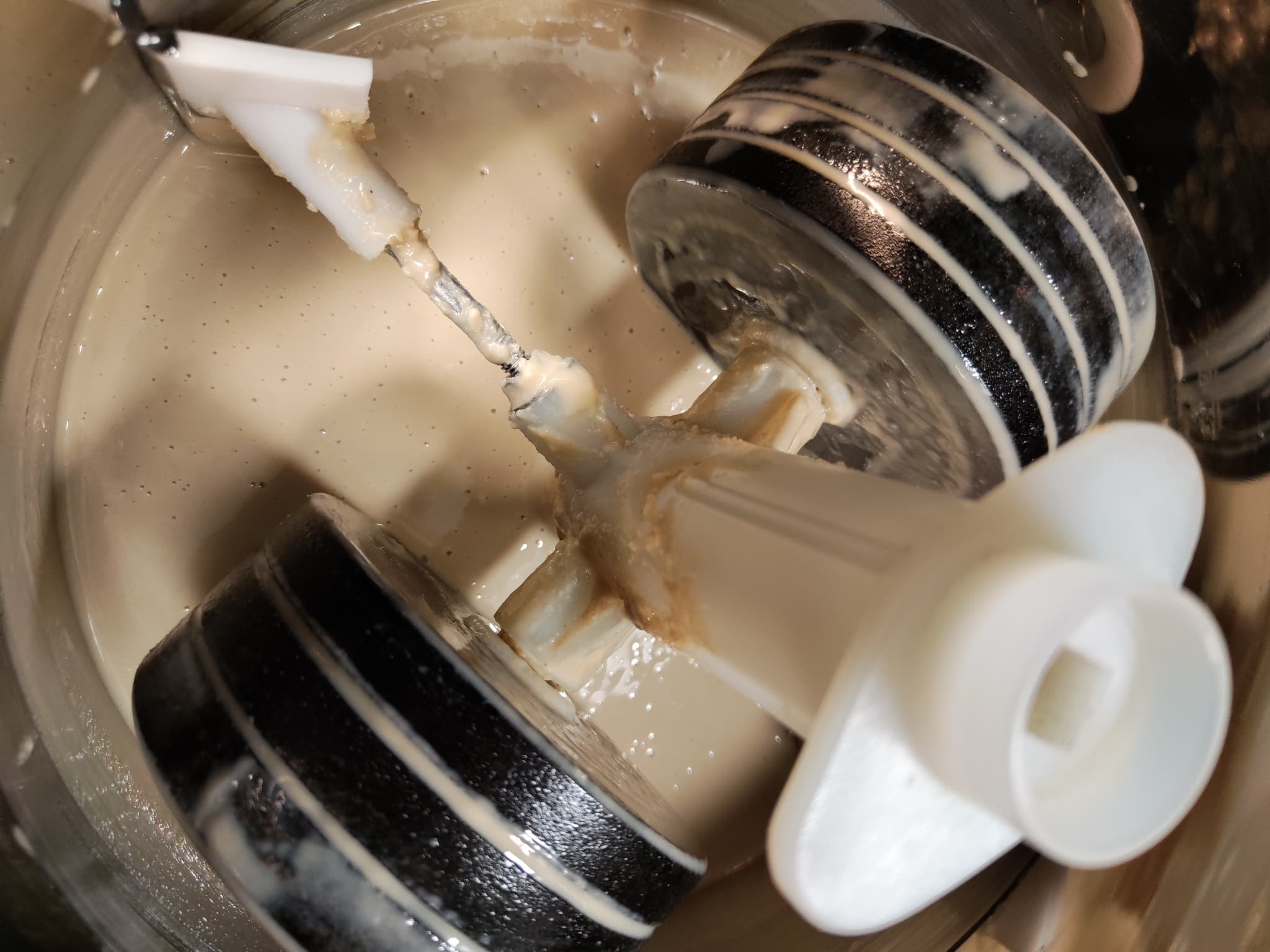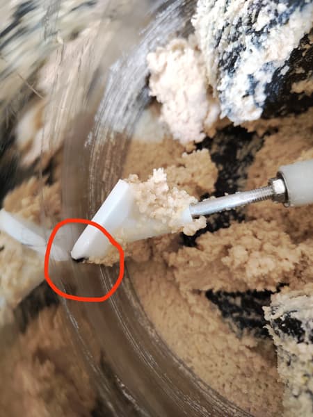 Тестомес представляет собой насадку с двумя лопастями, расположенными на разной высоте от дна емкости. Одна лопасть находится почти у дна, вторая возвышается на 2,5 см. Пластик, из которого сделаны насадки, толстый (2,5-3 мм) и производит впечатление чрезвычайно прочного.