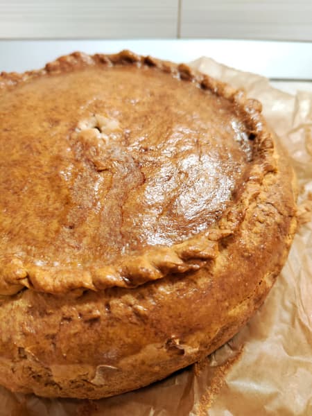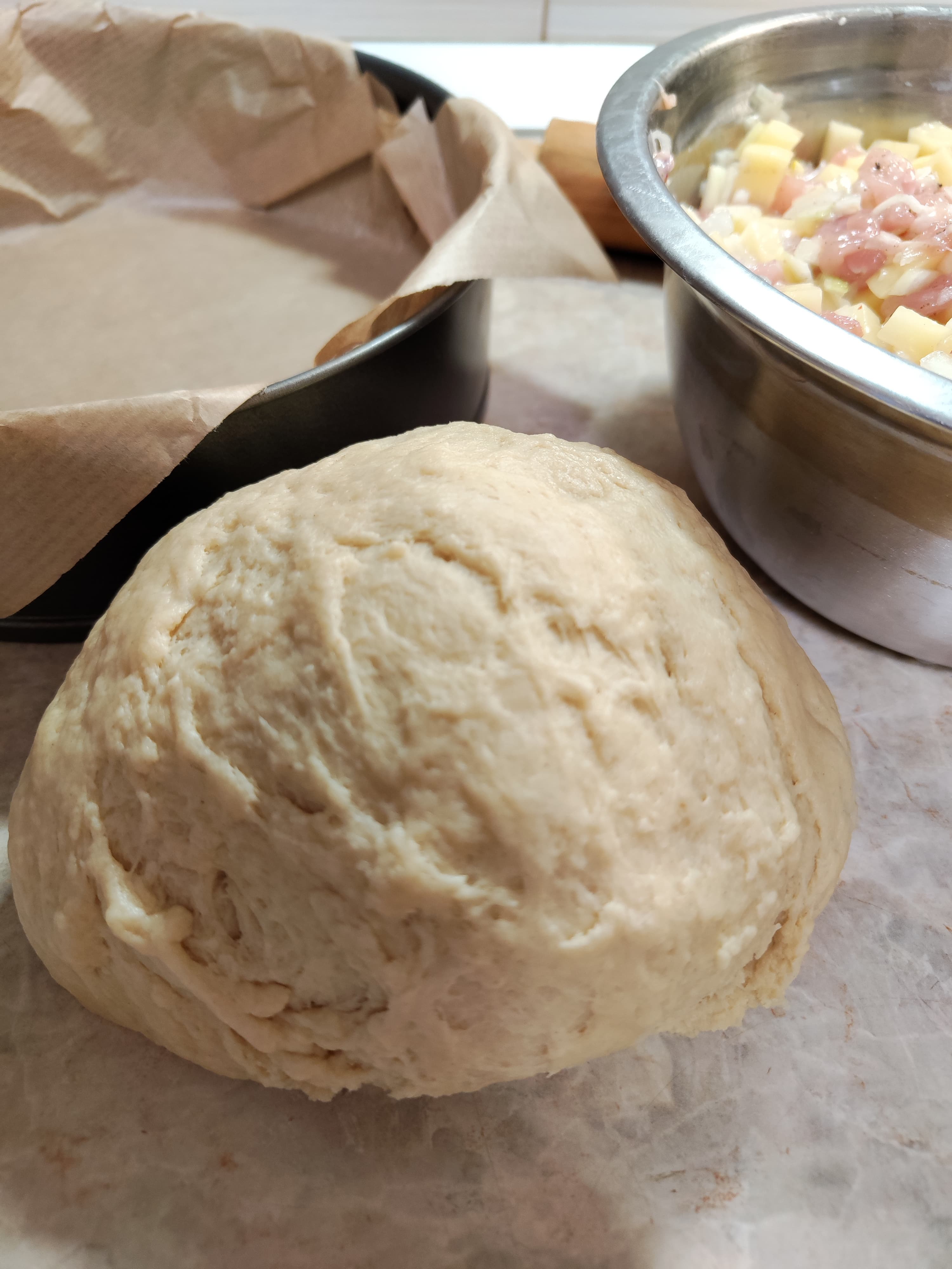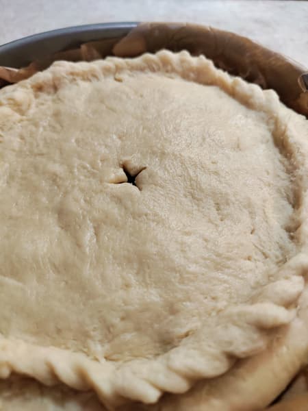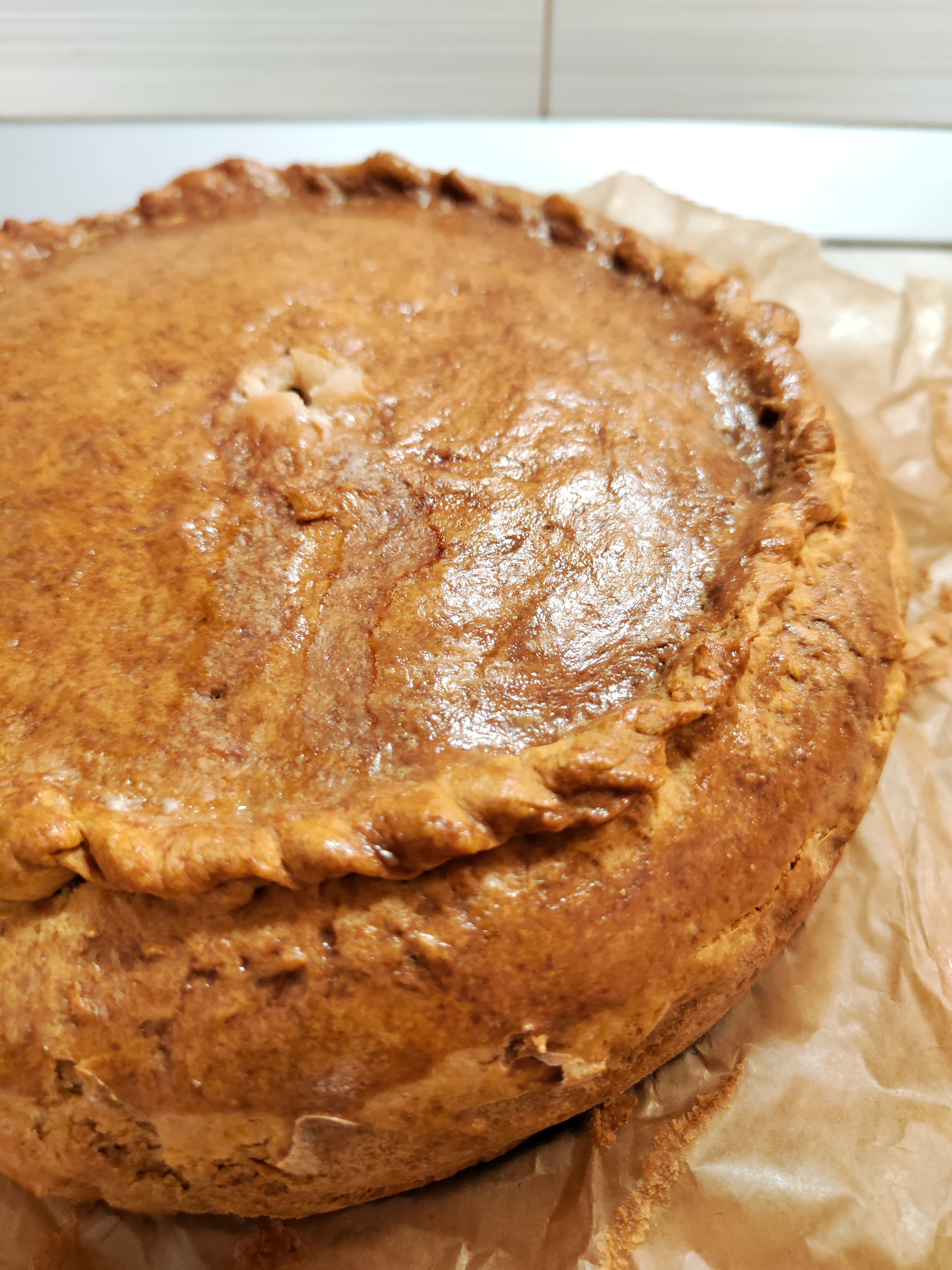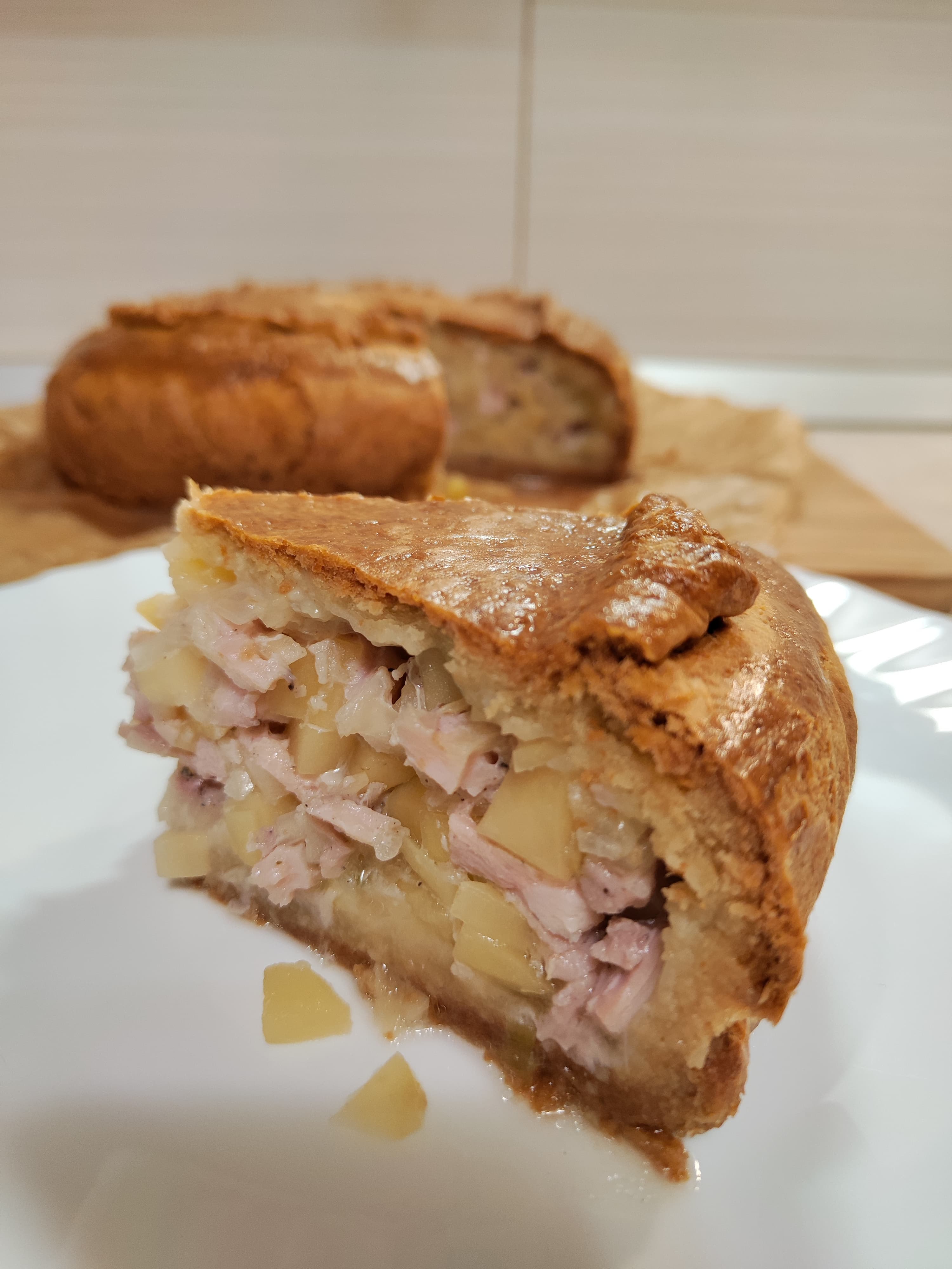 Застелили форму пергаментом, раскатали бо́льшую часть теста, выложили начинку, накрыли сверху малым кругом теста и защипали края. Не очень сложно, а выглядит прекрасно.