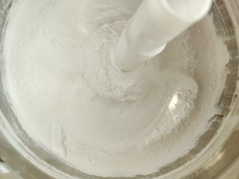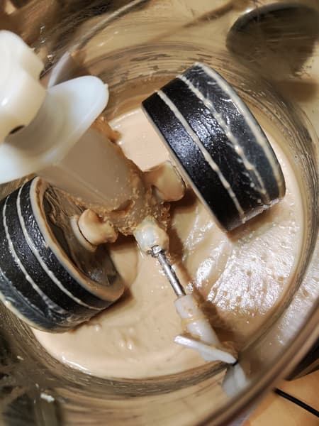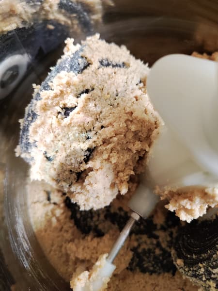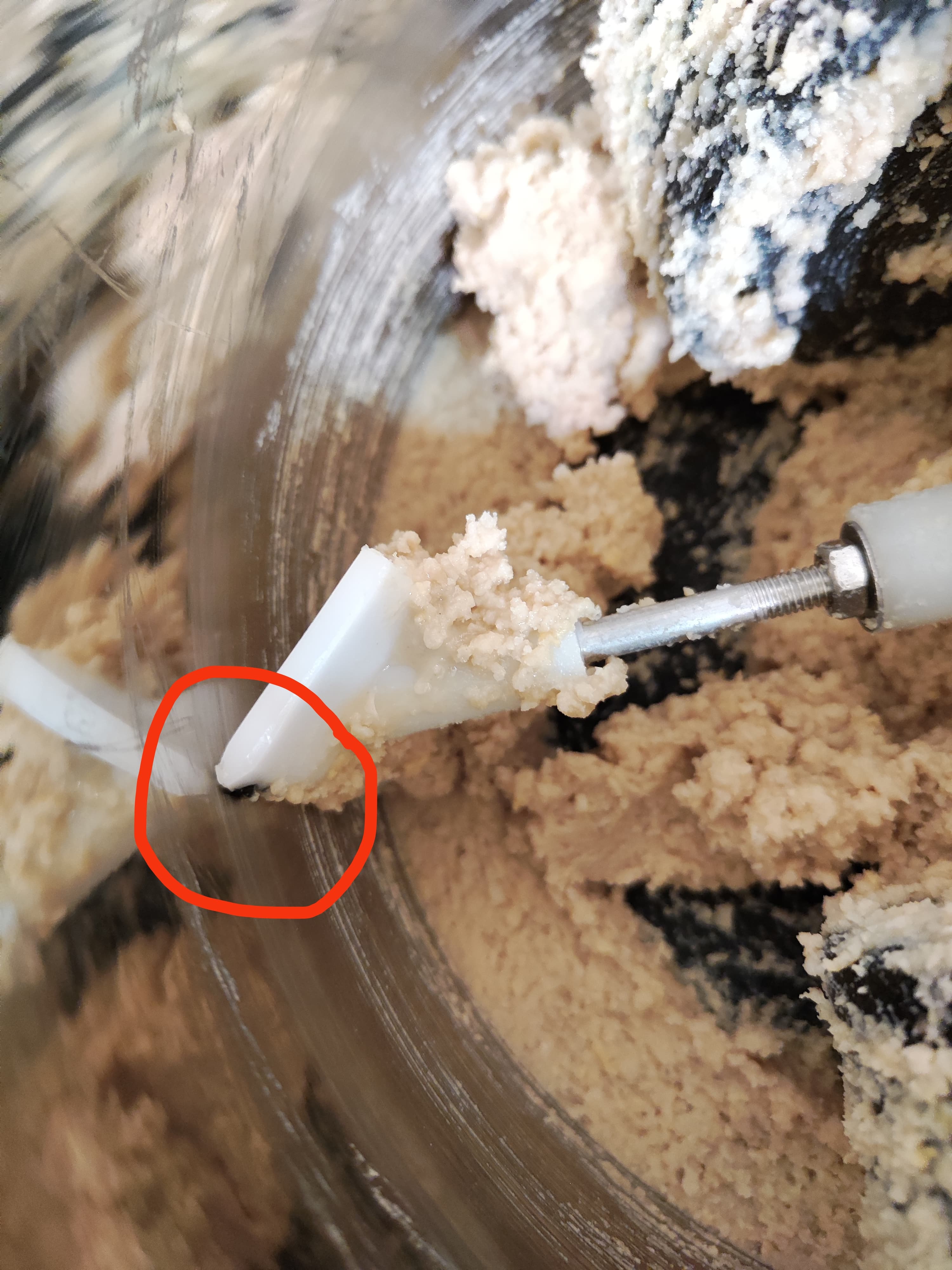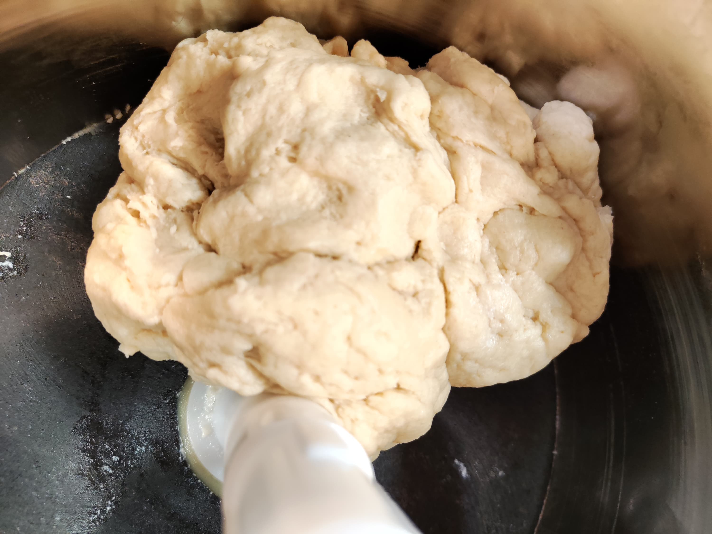 Напоследок протестируем дополнительную функцию меланжера — приготовление теста. Вставили насадку-тестомес, засыпали в чашу меланжера 500 г муки, добавили 250 мл кефира, 170 г растопленного сливочного масла, по 1 ч. л. соли, сахара и соды.