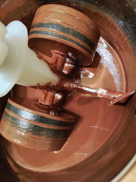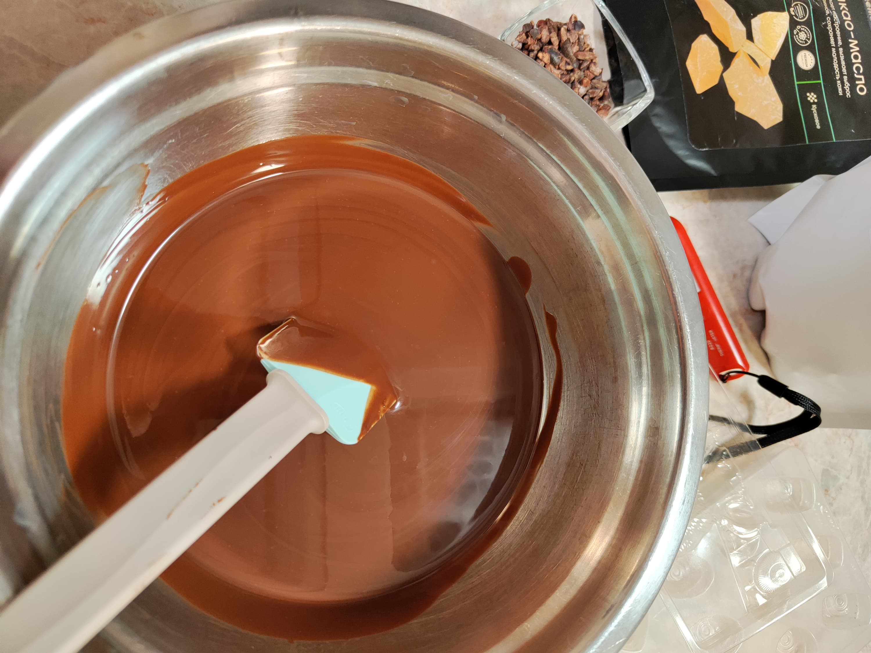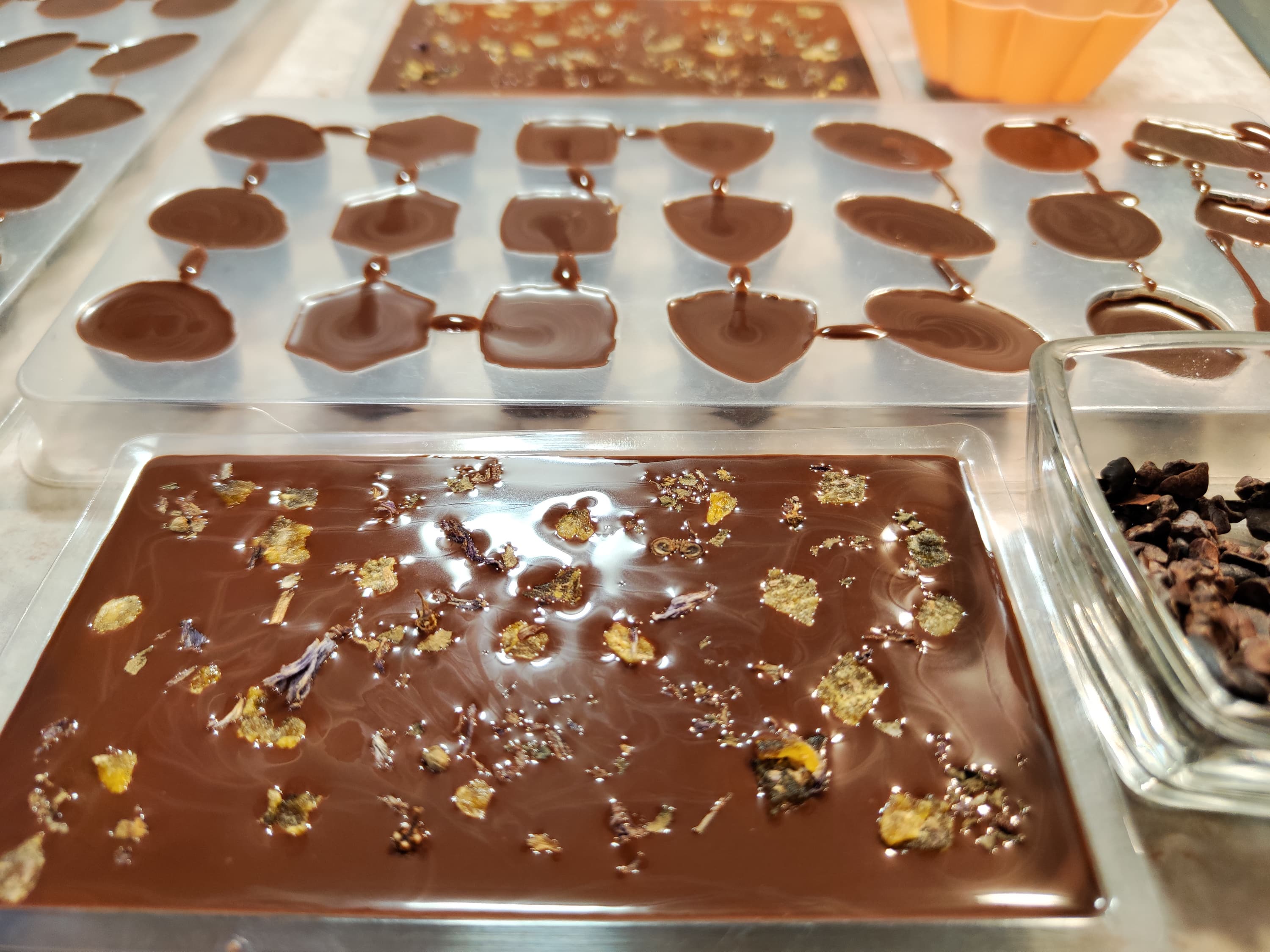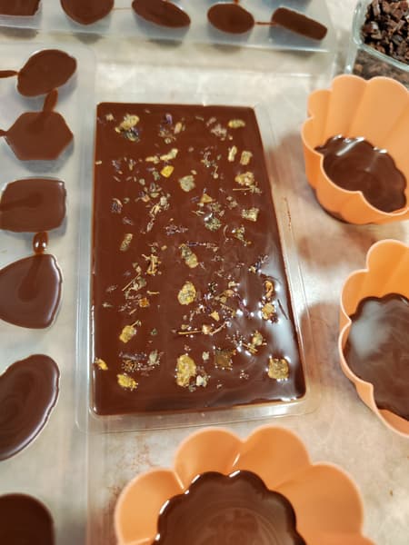 Затем на водяной бане мы подогрели шоколад до 31 °C и разлили его по формам.