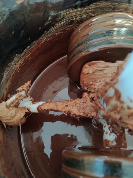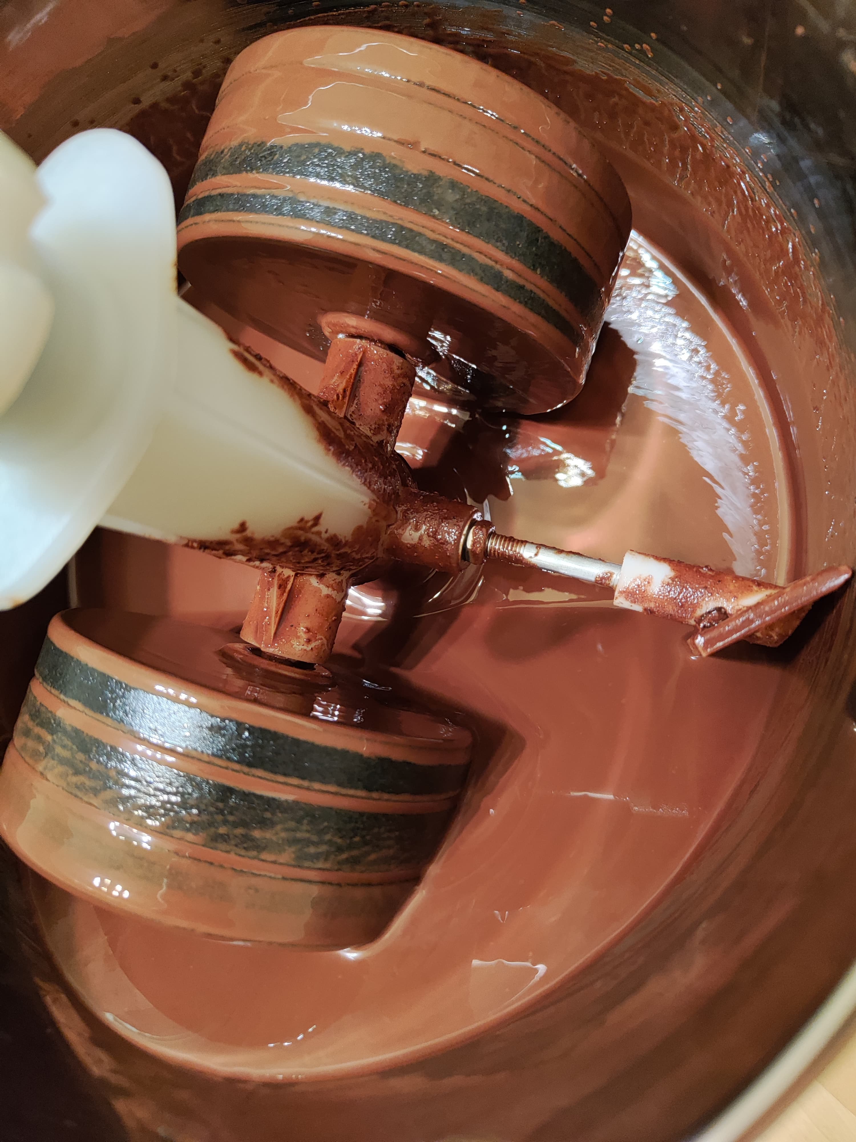 Масса стала жидкой уже через полчаса, хотя крупинки сахара ощущались и через час работы меланжера. Примерно тогда же счистили с выступающих частей конструкции (осей жерновов, скребков и их осей) застывшую шоколадную массу.