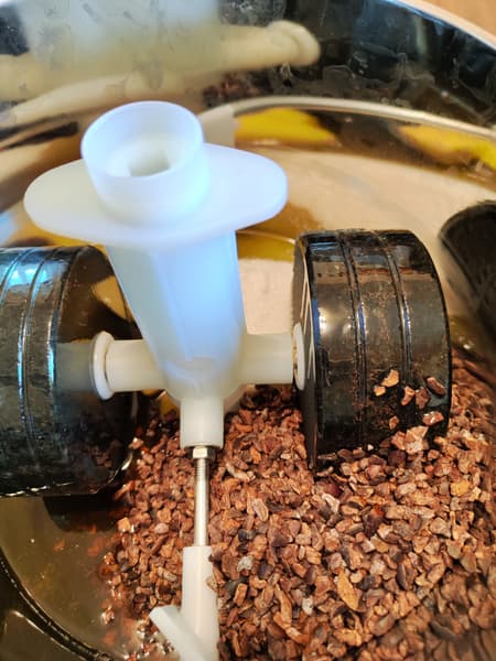 - Моторный отсек во время перемалывания нагревается: корпус становится ощутимо теплым. Продукт также повышает свою температуру, что помогает при приготовлении шоколада. Причем нагревается масса именно до нужных для правильных химических процессов конширования температур — 40-42 °C.