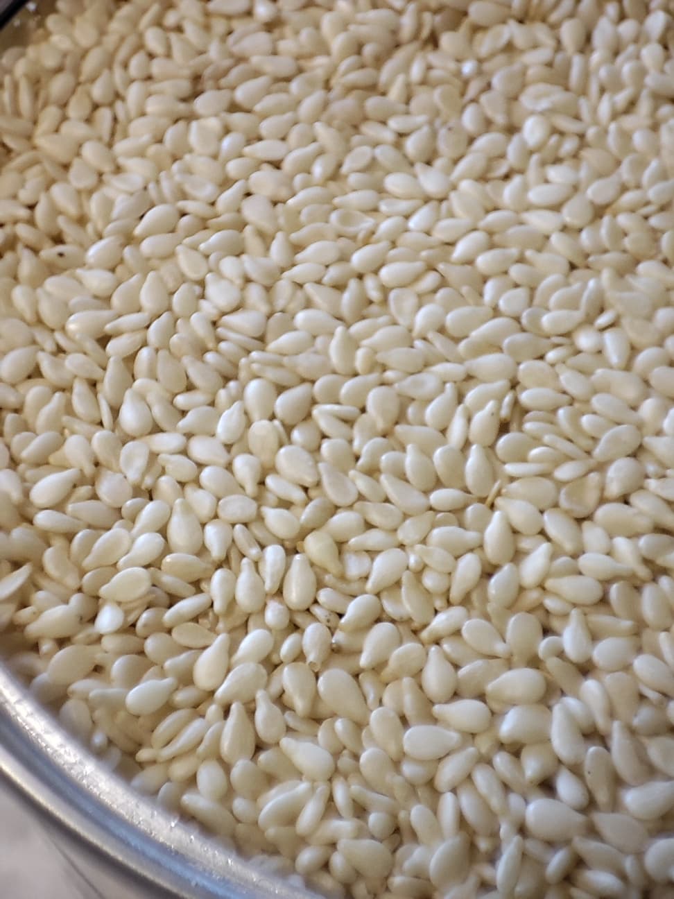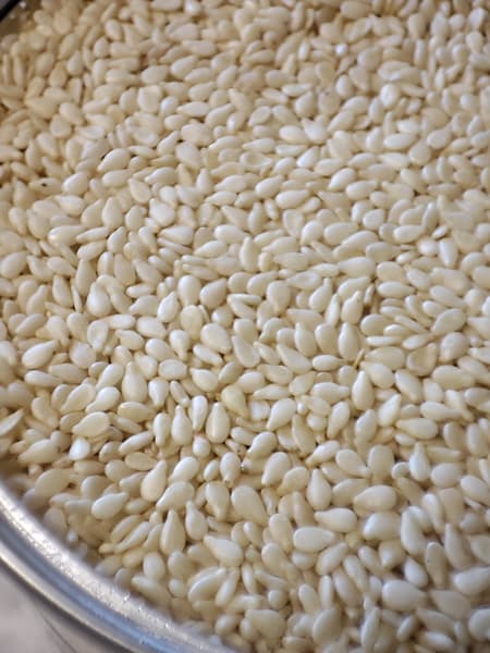 Для знакомства мы решили сделать несложный тест — тхину из белого кунжута. Взяли 500 г кунжута и предварительно подсушили в течение двух часов в духовке на 75 °C с конвекцией.