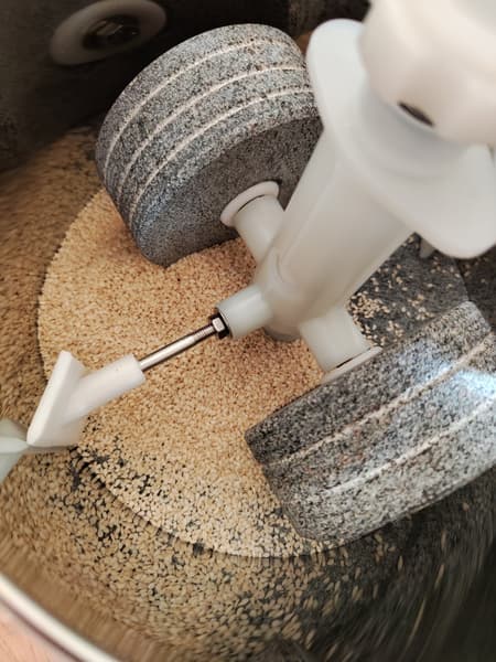 Через 15 минут зерна были перетерты в еще неоднородную, но уже липкую массу. Добавили еще треть кунжута, посмотрели, как равномерно и массово они уходят под жернова, вздохнули и досыпали остальное. Вообще, хочется отметить, что наблюдение за работой меланжера — занятие крайне залипательное. Белье в барабане стиральной машины против созерцания измельчаемых зерен — это привычный гул автомобилей за окном в сравнении с самым популярным ASMR-видео. Поэтому мы буквально усилием воли заставляли себя отойти и оставить прибор в покое.