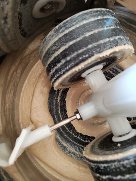 Примерно через час в емкости уже была жидкая масса, однако на торцах жерновов и на центральной оси налипло некоторое количество измельченных, но не перетертых в жидкую массу зерен. С помощью комплектной лопатки мы их счистили и оставили меланжер в одиночестве еще на час.