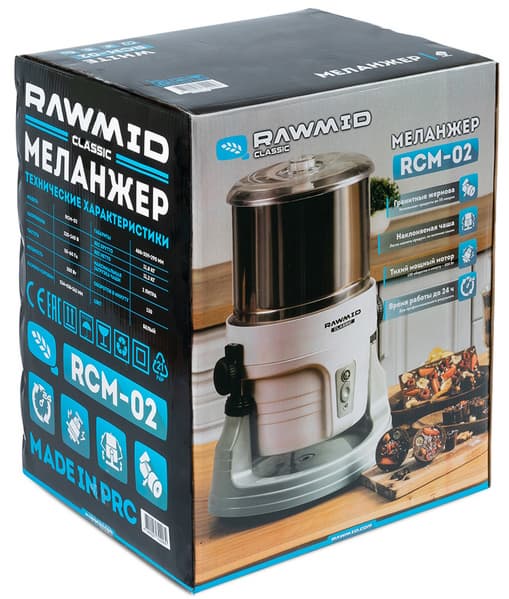 Прибор упакован в две коробки: транспортировочную из плотного гофрированного картона и более привычную для потребителя внутреннюю. И если внешняя коробка предназначена, прежде всего, для сохранности аппарата, то изучение информации на внутренней поможет пользователю составить впечатление о меланжере Rawmid Classic RCM-02: познакомиться с его внешним видом и особенностями.