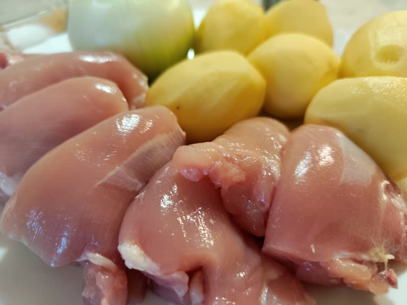 Мелко порезали картофель, филе куриных бедер и большую луковицу. Сдобрили солью, перцем и тщательно перемешали.
