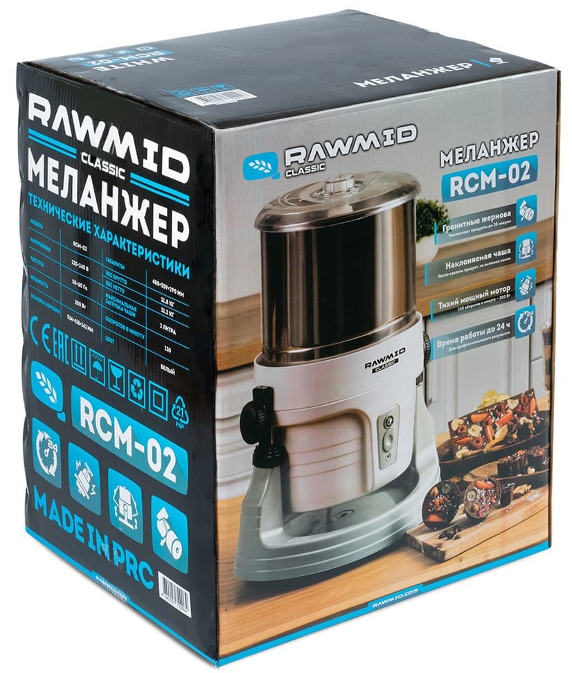 Первое, что обращает на себя внимание, это вес меланжера Rawmid Classic RCM-02: аппарат весит более 11 кг. По-другому и быть не может, поскольку прибор изготовлен, в числе прочего, из гранита и стали.