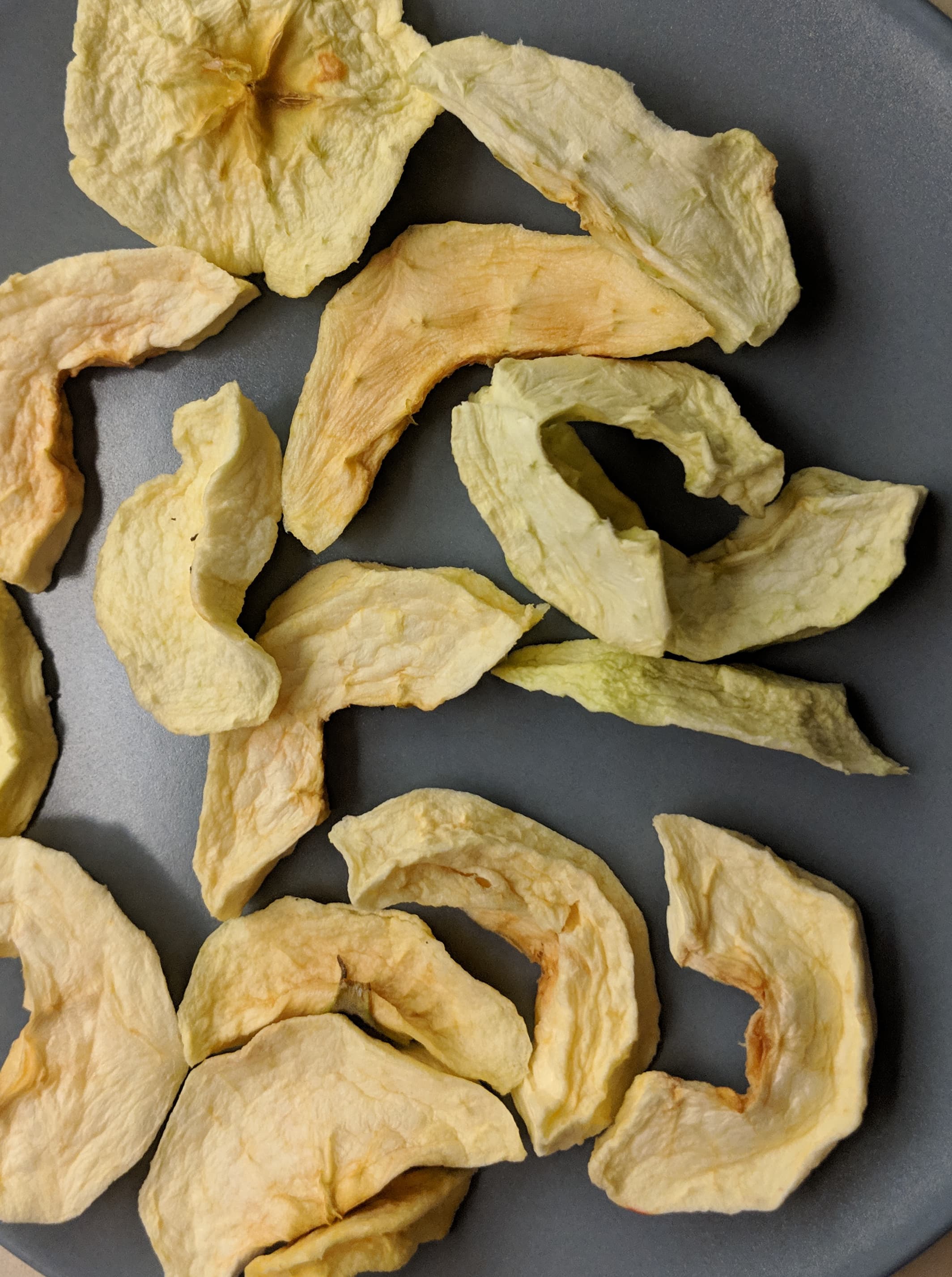 Результат: равномерно просушенные яблоки естественного бледно-желто-зеленого цвета (только некоторые чуть-чуть потемнели), сохранившие естественный вкус и ставшие из рассыпчатых плотными.