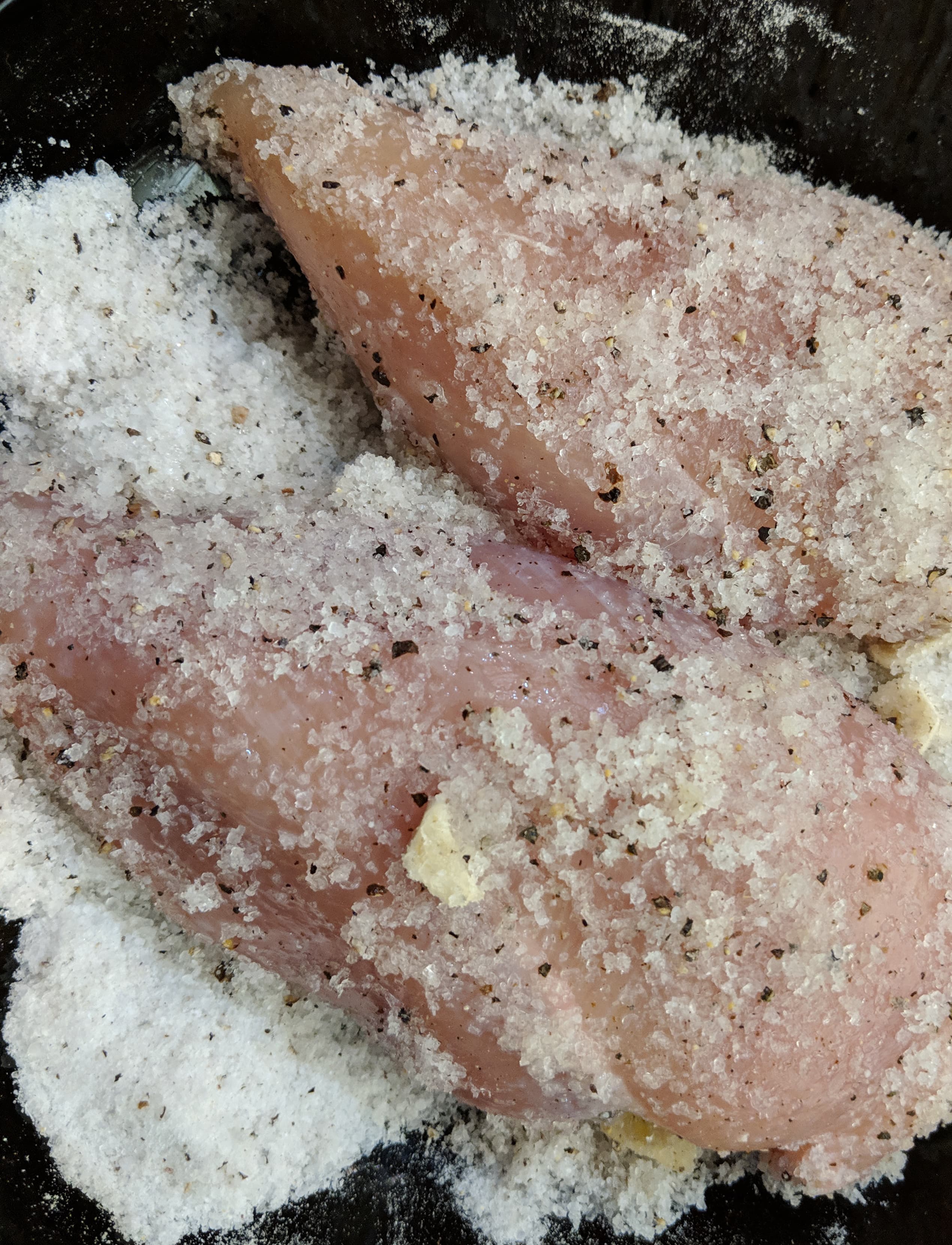 Для еще одного мясного блюда куриная грудка целиком была обработана сухим посолом в смеси соли, крайне небольшого количества сахара, значительной дозы черного перца и полуголовки нарезанного лепестками чеснока. Время посола — 12 часов. Приготовление: теневой режим, 40 градусов, 40 часов. Изначально мы поставили таймер на 48 часов, но решили не пересушивать — и не прогадали.