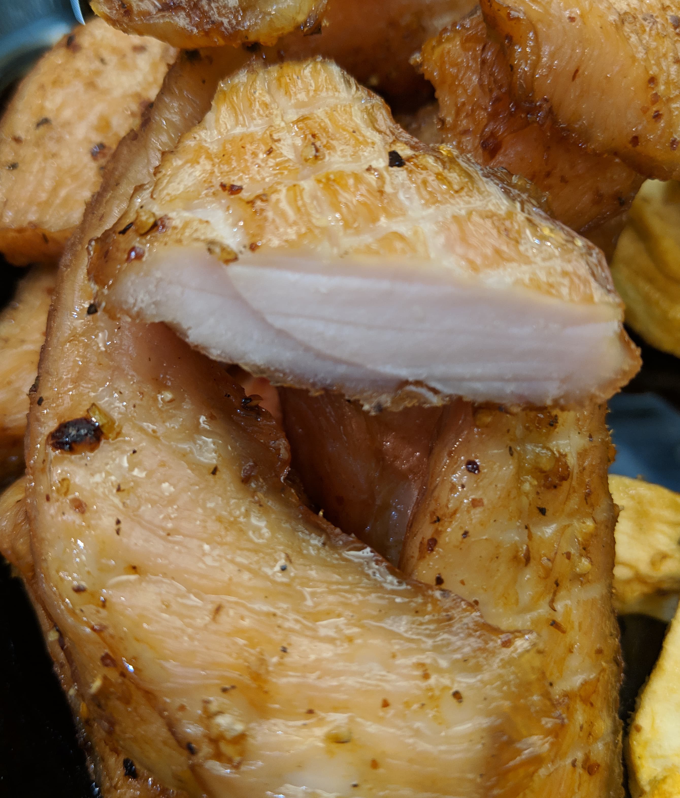 Тонкие и толстые куски по всей глубине прибора показали разные результаты: толстые превратились в курицу запеченную, причем без потери сочности, а тонкие стали куриными чипсами. И то, и другое было настолько вкусно, что тарелка опустела практически сразу.