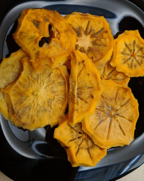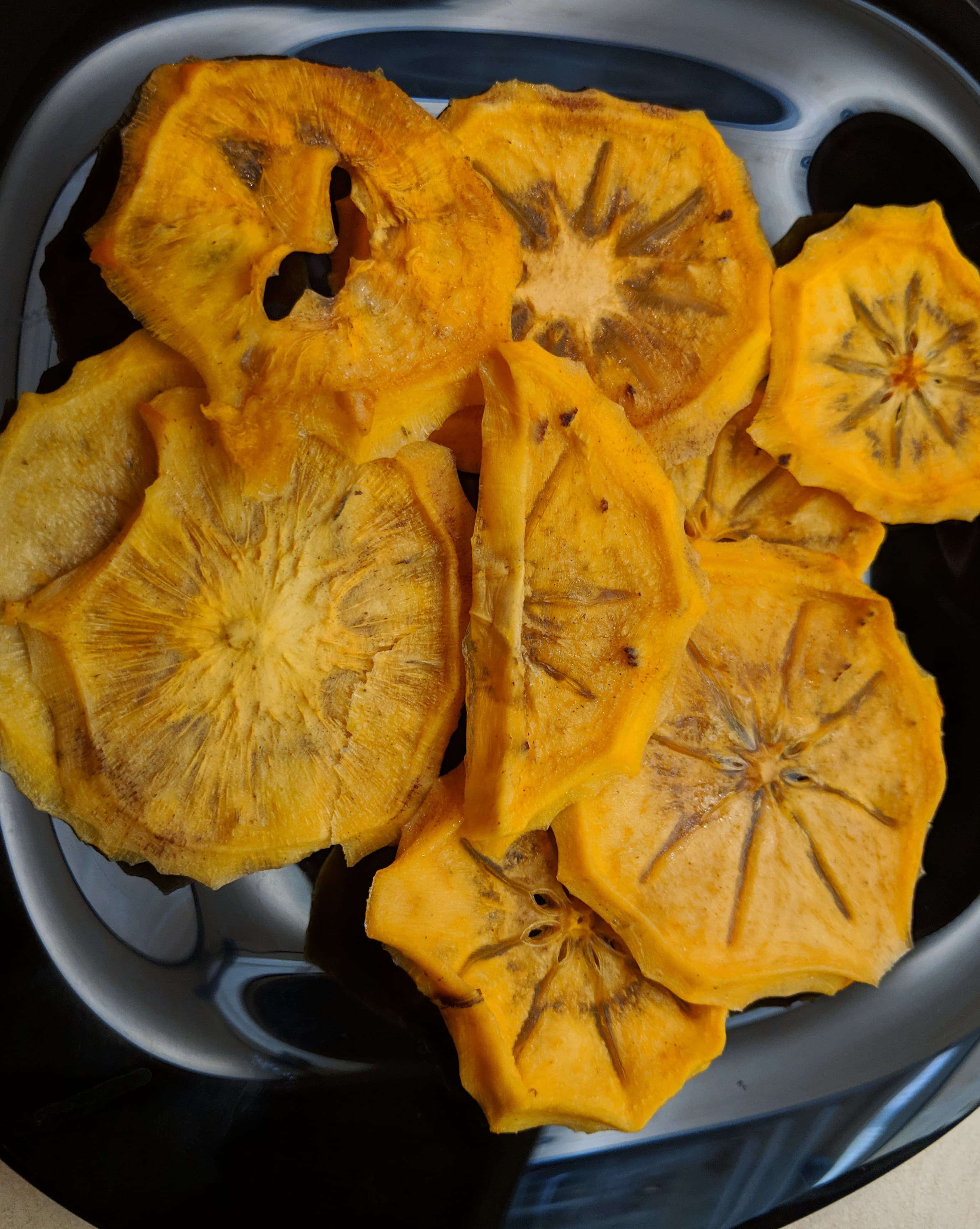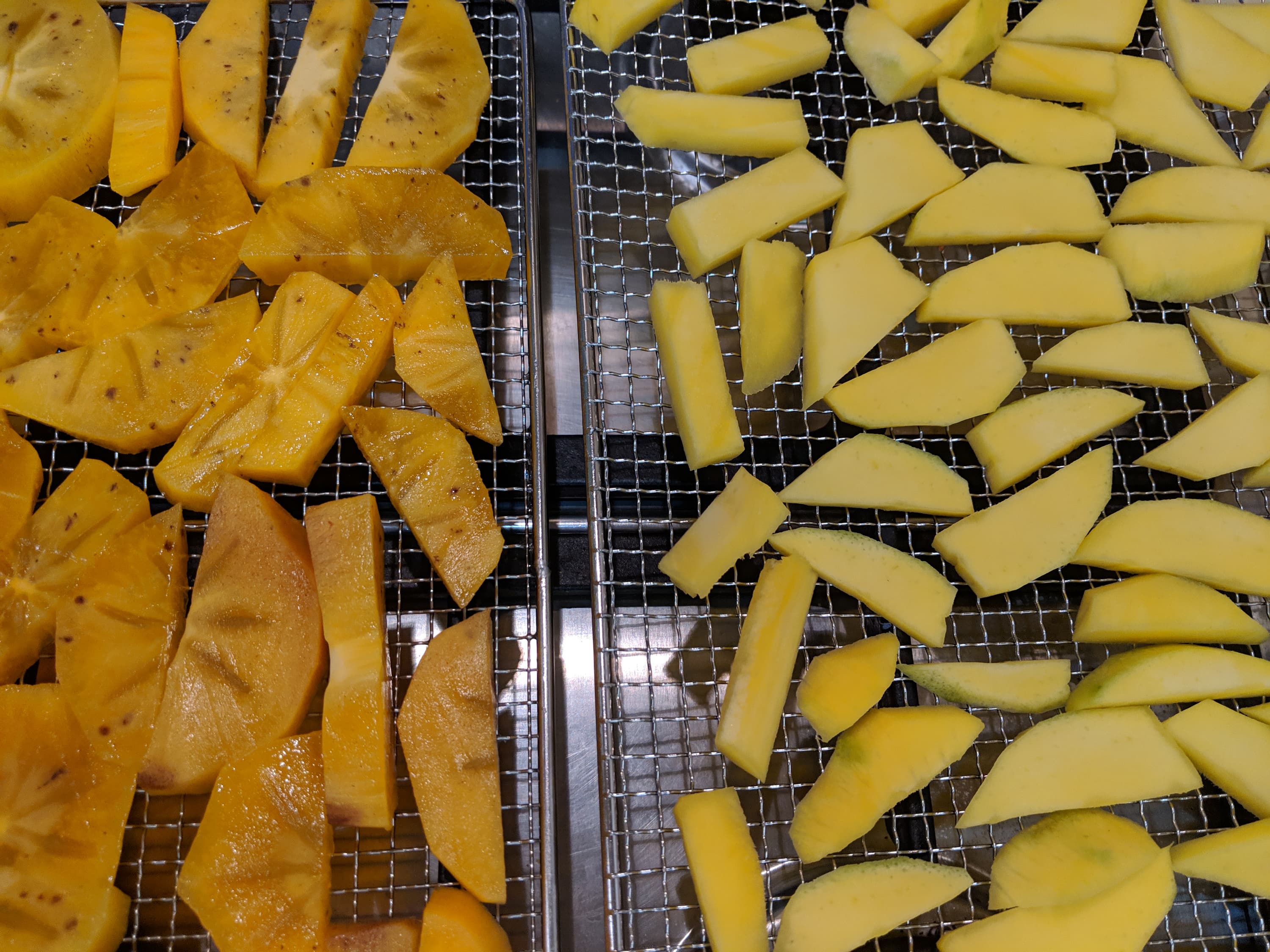Первым, что мы попробовали приготовить в дегидраторе, оказалась хурма. Так получилось, что часть плодов была слегка недозрелой и чуть-чуть вяжущей, а другая — в той стадии зрелости, когда нарезать ее дольками еще можно, но уже с некоторым трудом, а еще немного — и придется есть ложкой.