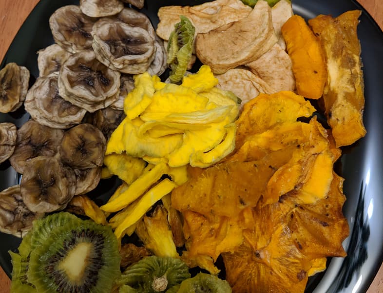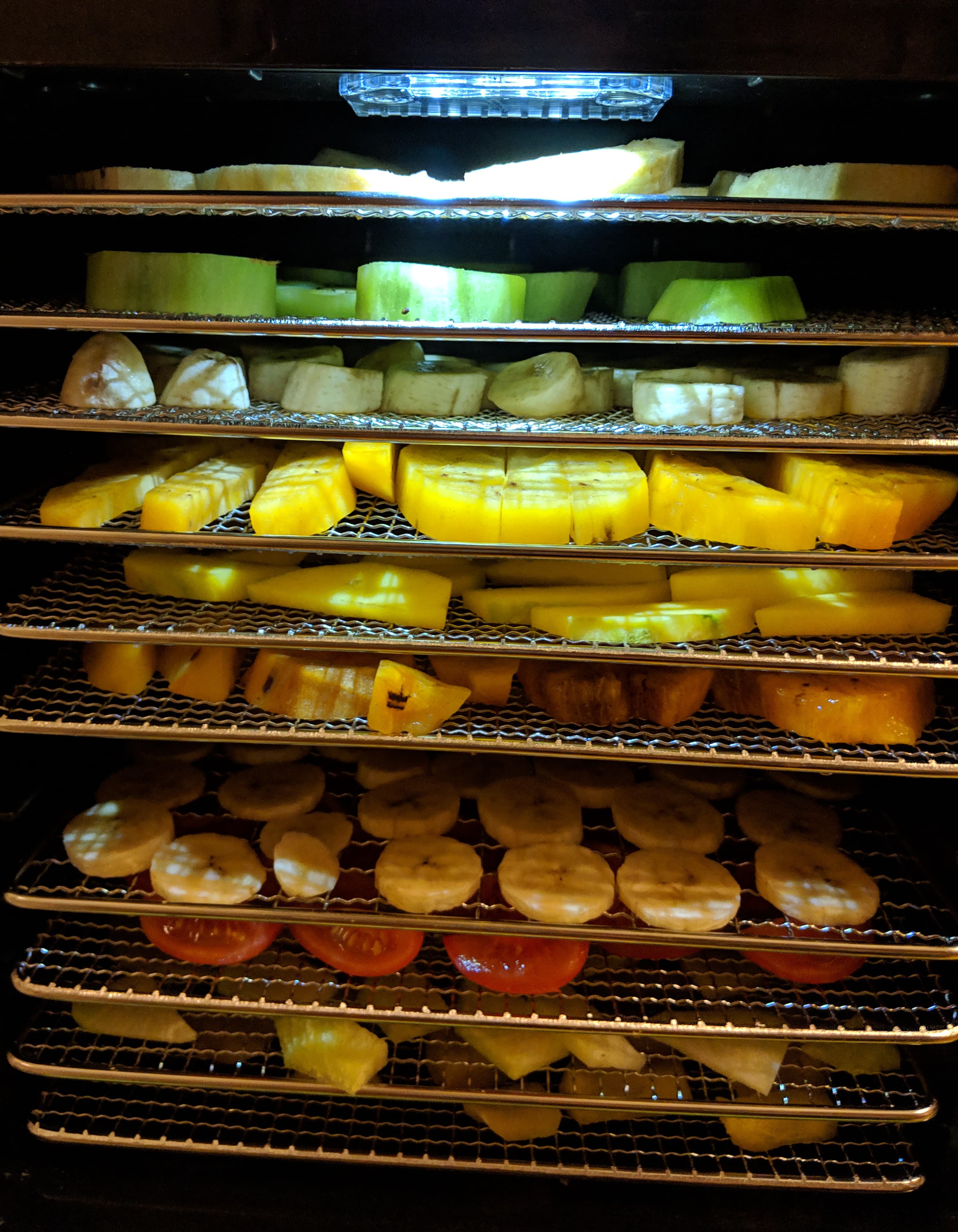 Затем мы перестали отдельно готовить какие-то фрукты и устроили фруктово-овощное ассорти. Заодно проверили, так ли хорошо и равномерно сушатся продукты, если полностью забить все 11 лотков дегидратора.