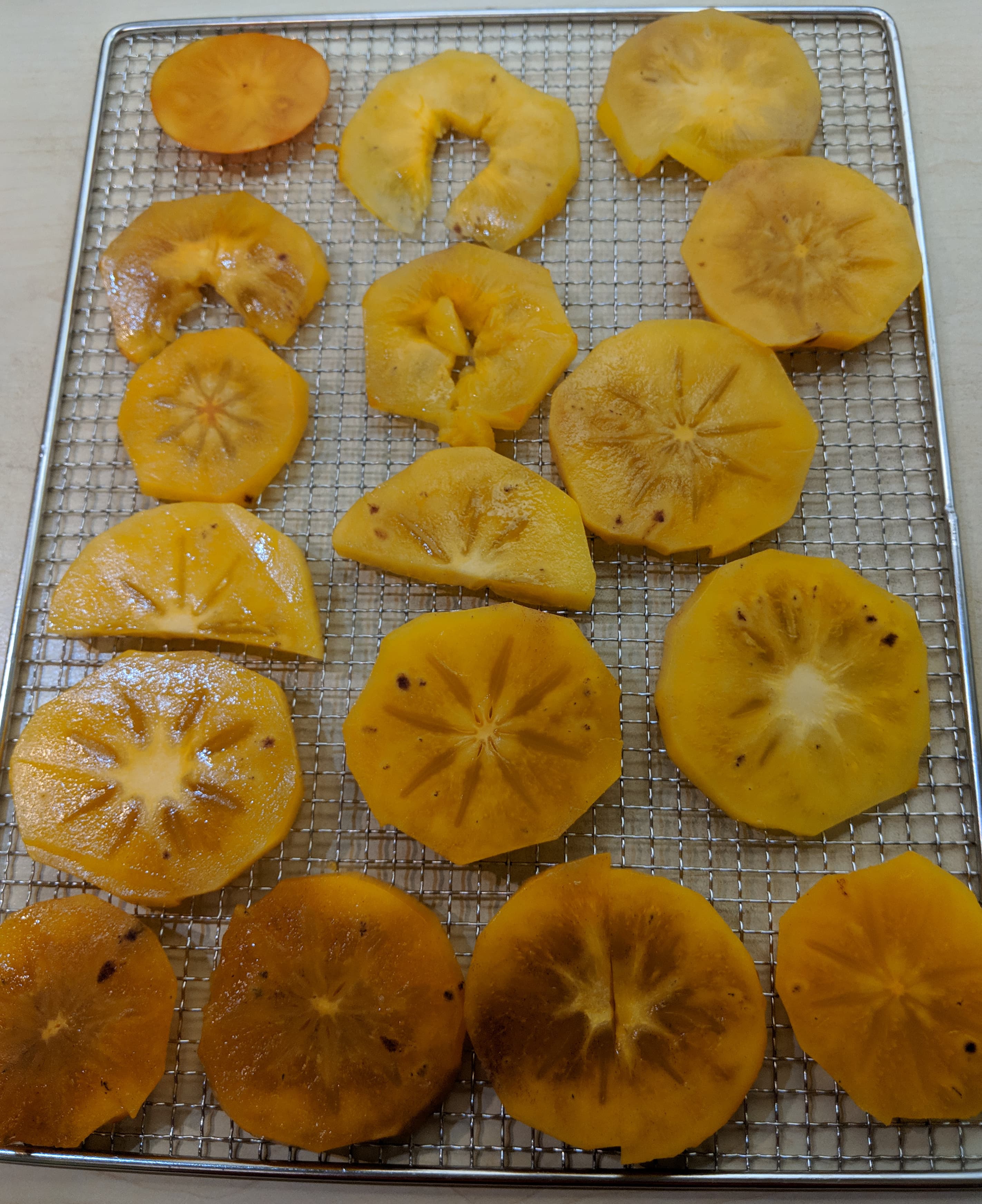 Плоды были нарезаны кольцами и полукольцами, освобождены от шкурки и завялены без всякой дополнительной обработки на смешанном (солнечно-теневом) режиме. У нас были некоторые сомнения, справится ли дегидратор со спелой хурмой за заявленные как минимальный срок 11 часов или придется дополнительно досушивать.