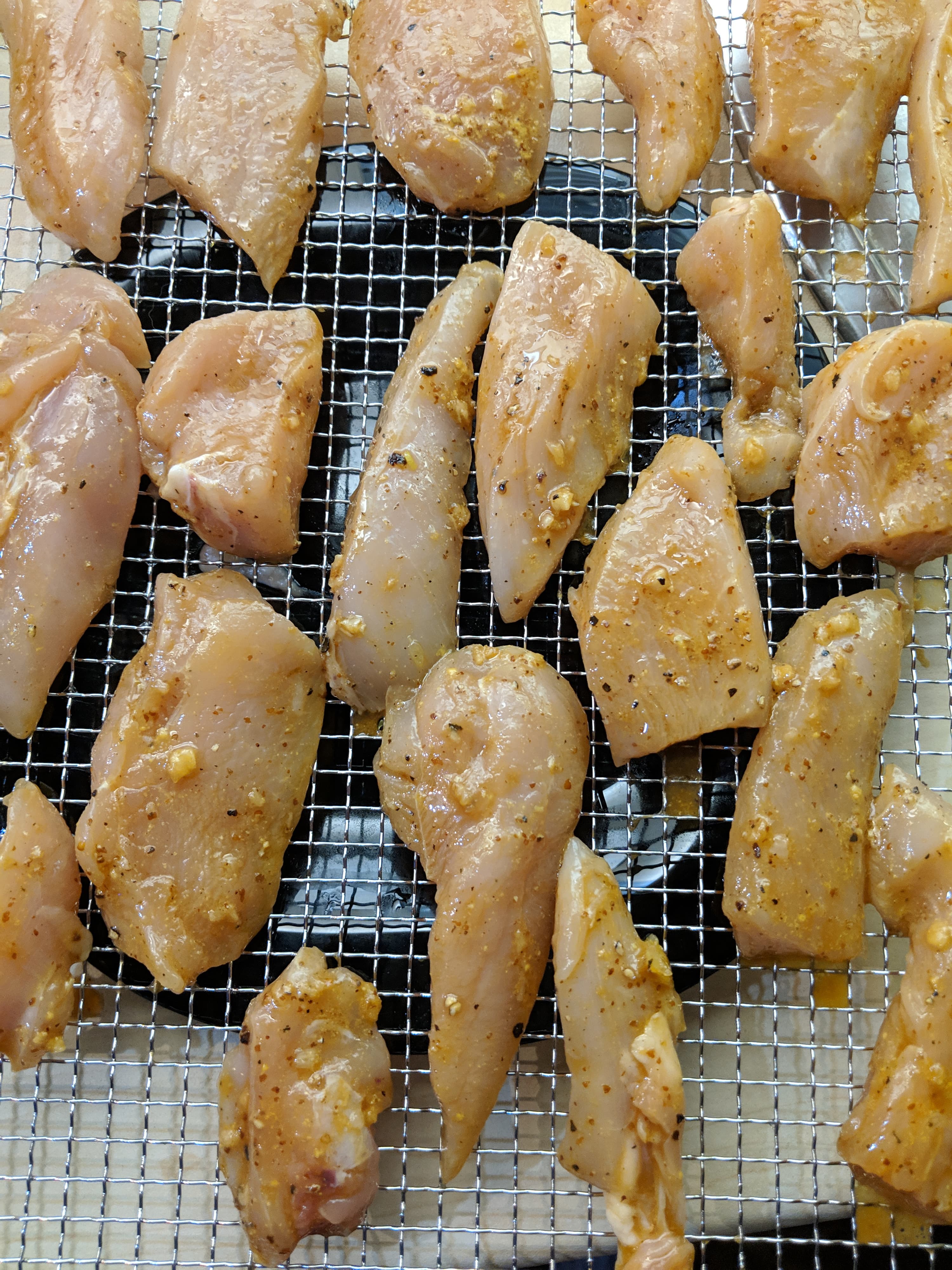 Для первого варианта был смешан маринад из соевого соуса, оливкового масла, черного перца, измельченного чеснока и апельсинового сока. Филе куриной грудки, нарезанное кусками двух разных калибров (потолще — примерно три сантиметра, и потоньше — около сантиметра) было замариновано в получившейся достаточно жидкой субстанции в течение часа, разложено на решетке и поставлено на солнечный режим сушки (60 градусов и 6 часов).