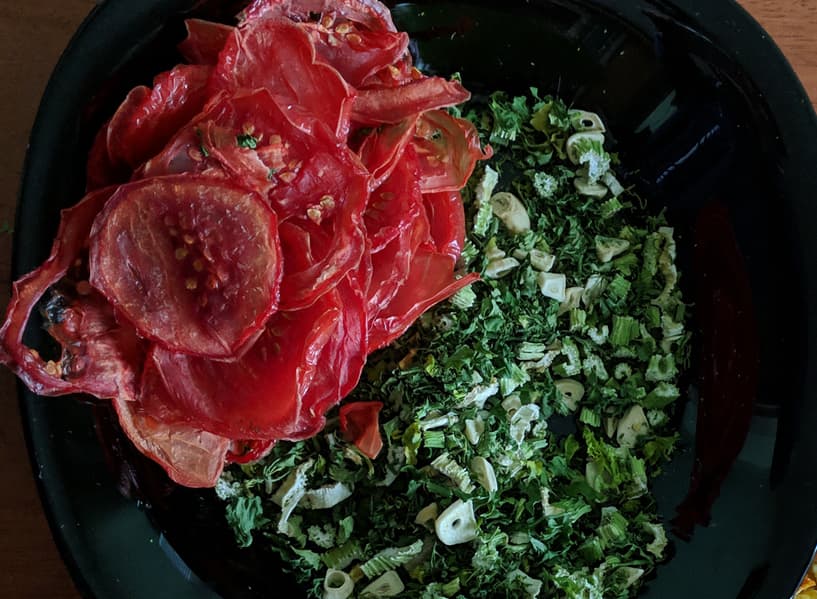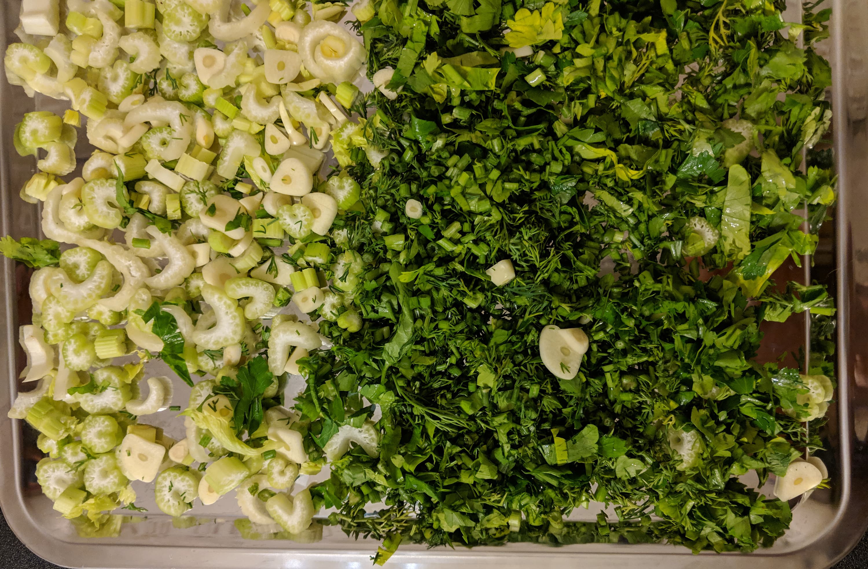 Для утилизации зелени, оставшейся после новогодних празднований, мы решили сделать ароматную смесь, которую можно будет добавлять в супы, тушения и гуляши. Нарезали по пучку укропа и петрушки, стебли сельдерея и чеснок лепестками. Распределили смесь по подносу и поставили на шесть часов в режиме теневой сушки (40 градусов).