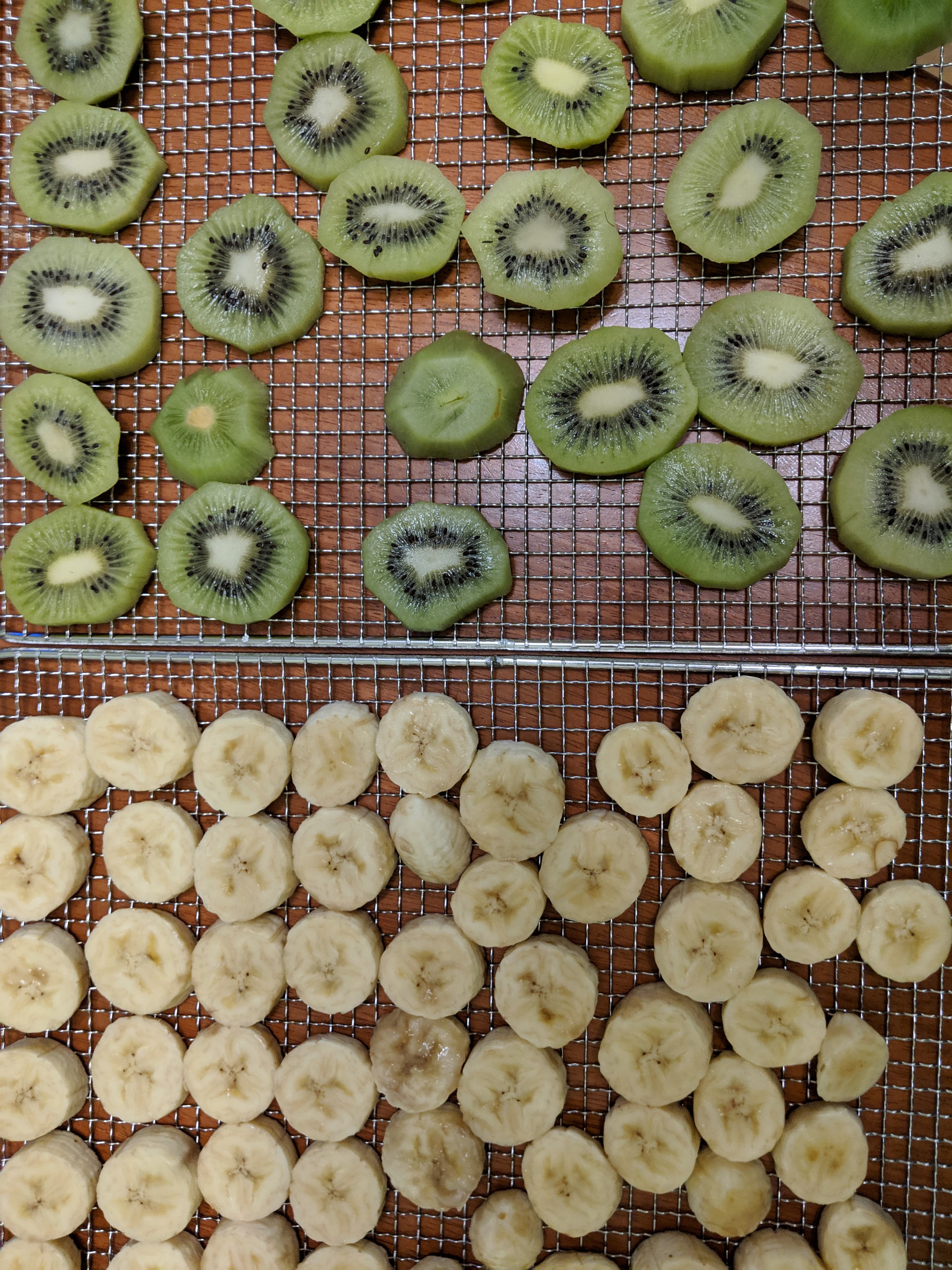 Мы, в основном, измеряли количество исходного продукта и получившийся выход. Так, если взять ровно полкило целых киви из магазина, то в нарезанном и подготовленном виде они будут весить уже 390 граммов, так как мы срезали с них шкурки. В засушенном же виде выход получится 100 граммов — в слегка похрустывающем виде, то есть получится нечто среднее между вялеными фруктами и фруктовыми чипсами.