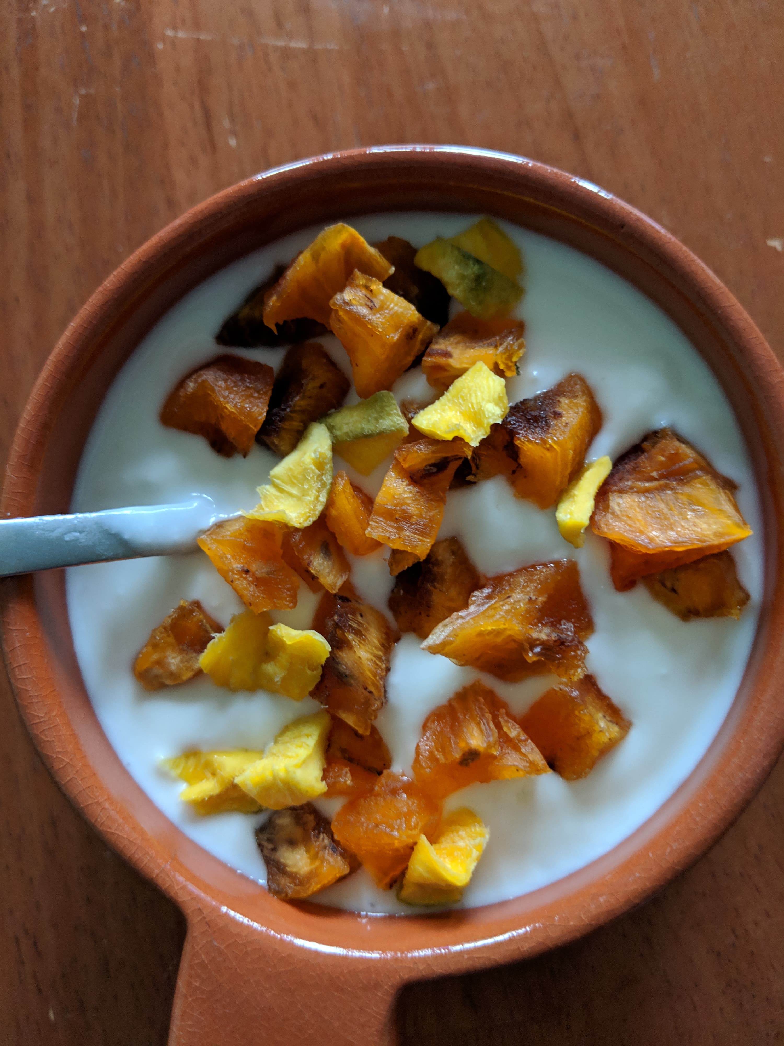 Разумеется, мы не прошли мимо возможности приготовить в дегидраторе йогурт. В приложенном руководстве в молоко (любое) рекомендуют добавить сухое молоко фабричного производства (для нежности консистенции), но мы этого делать не стали.