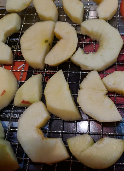 Яблоки самого простого сорта, не выбирая по плотности, мы очистили от кожуры и нарезали полукольцами. Ломтики толщиной 5-7 миллиметров замочили на десять минут в равной смеси воды и лимонного сока и отправили сушить в смешанном режиме на 8 часов. Температуру оставили по умолчанию: 60 °C на солнце, 40 °C в тени.