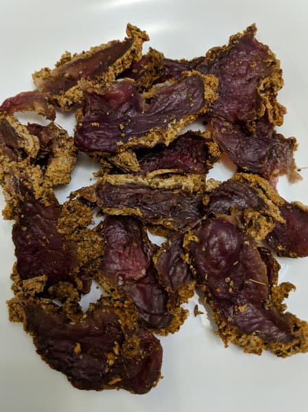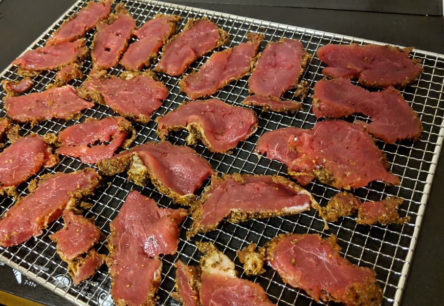 Мясо в сухом маринаде поместили в прохладное место на двенадцать часов (можно и меньше), затем нарезали тонкими ломтиками, освободили от пленок и лишних пряностей, положили в дегидратор и сушили на солнечном режиме при температуре 65 градусов в течение трех часов.