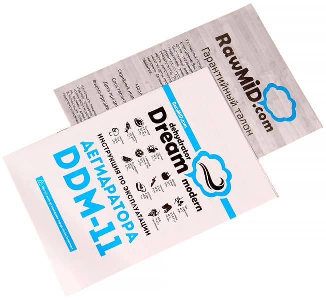 К дегидратору прилагается брошюра-инструкция, в которой подробно описана работа с прибором, правила безопасности и принципы управления, а кратко — какое сырье как сушить. Сведения о последнем в краткой форме указаны прямо на обложке.
